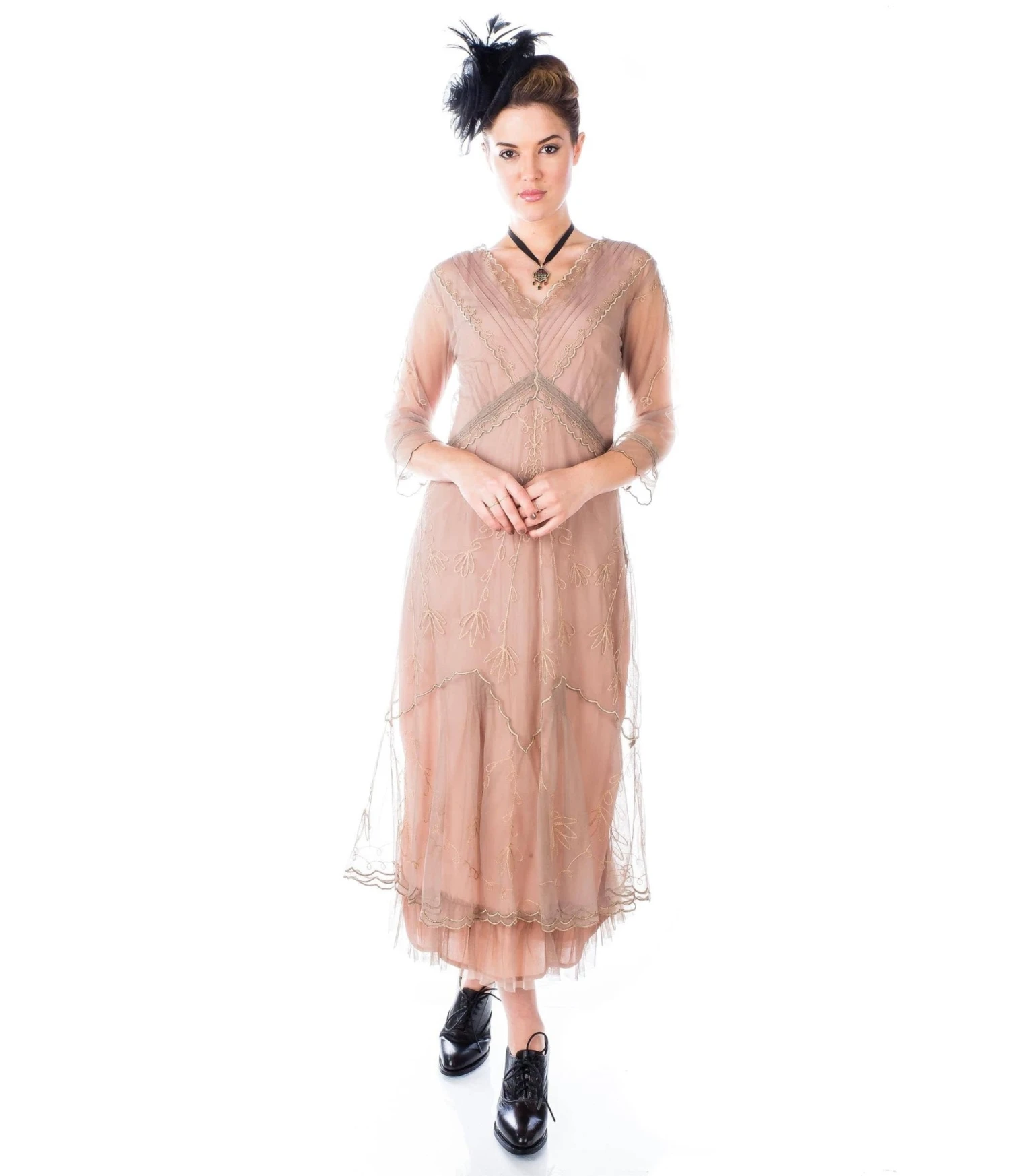 Create that magical, vintage inspired look, darling! A sleek 1920s inspired dress from Nataya is designed in a delicate nude and sand tulle with impeccable embroidered stitching. A crossed empire embroider over a nude crepe slip with a lovely hem for a graceful layered effect. The illusion style sleeves are perfect for that modest look yet has a peek-a-boo effect. Add a headband and get ready to set off a memorable night!