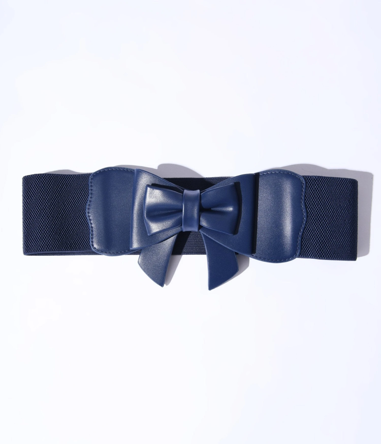 Whittle your waist and watch as they fall, dolls! This stunning navy blue leatherette belt by Banned is an absolute must for midcentury mavens – cinch and celebrate those flawless curves for a flawless retro Pin-up silhouette. This thick elasticized belt boasts a darling bow front, fastening with a two point hook clasp that renders a perfect hourglass.