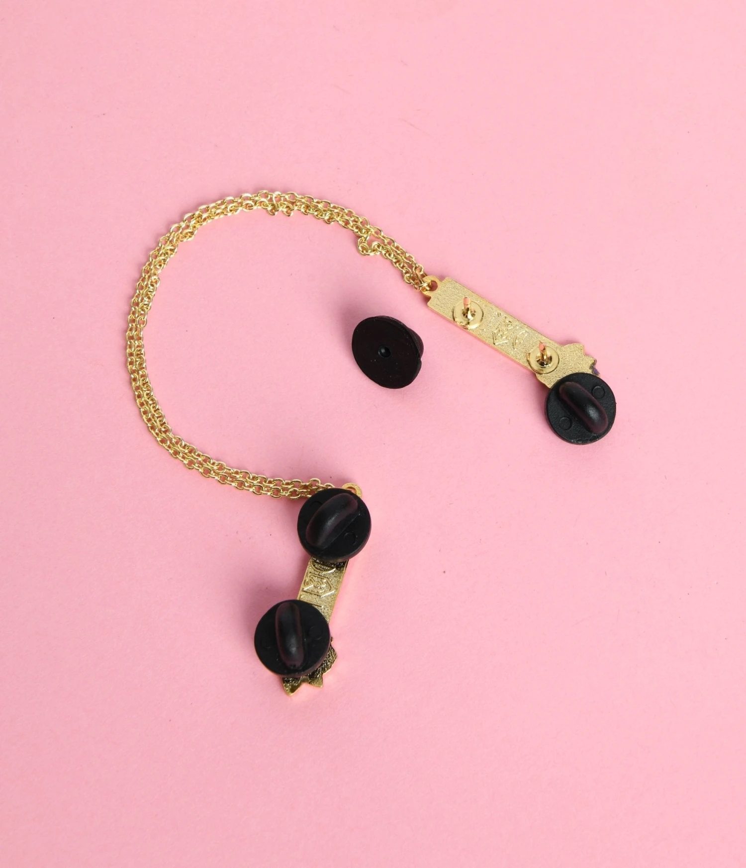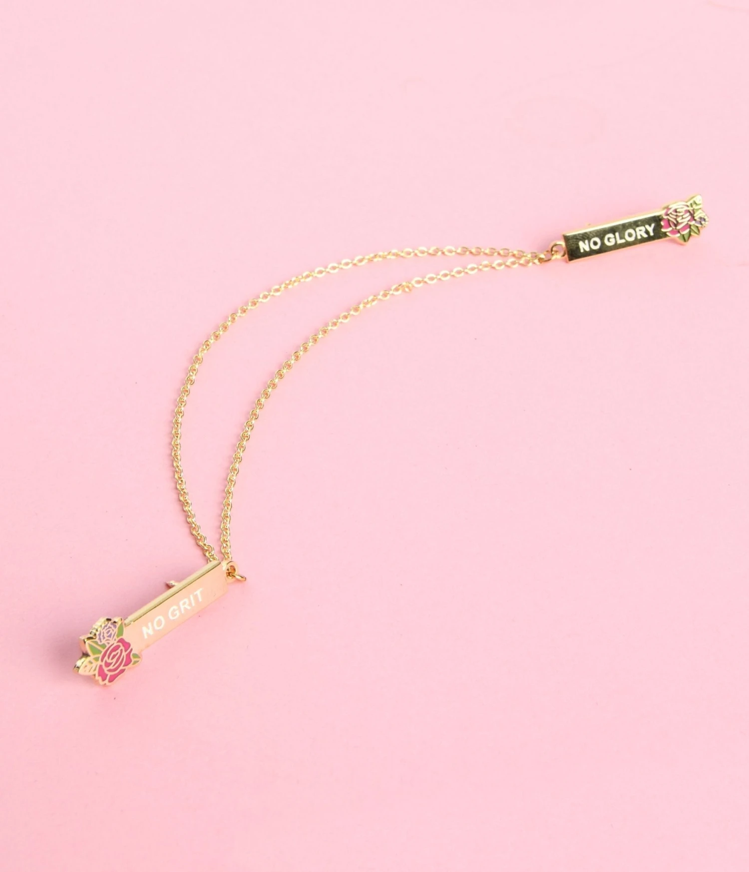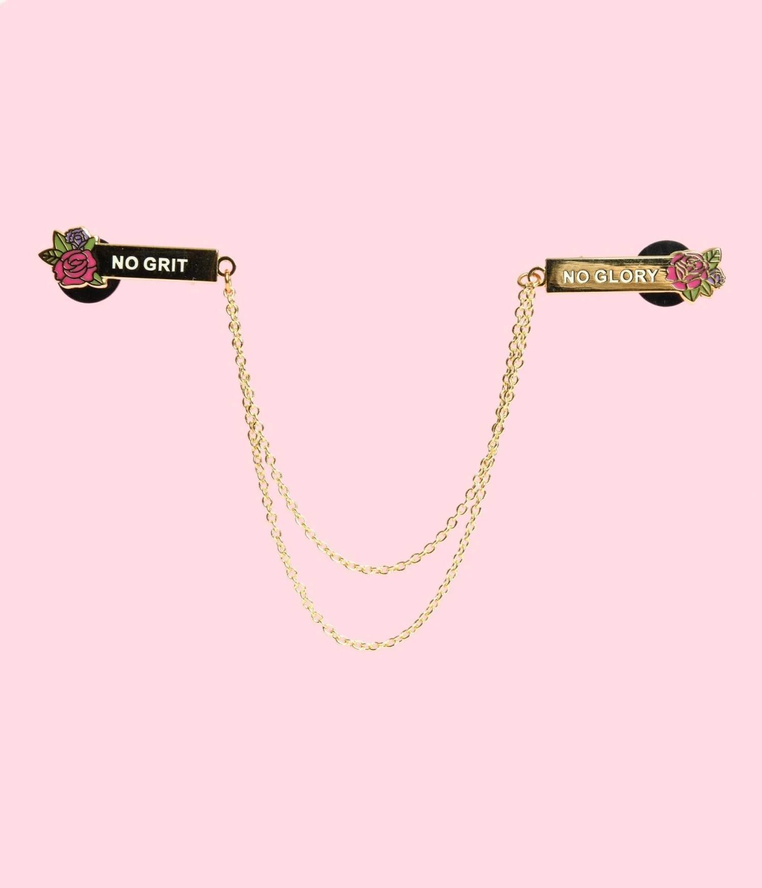 This set features two gold plated hard enamel bars showcasing the empowering words “NO GRIT, NO GLORY”, delicately surrounded by exquisite roses that symbolize strength and beauty. The addition of gold chains not only adds a touch of modernity but also keeps your pins securely in place. With convenient rubber back closures, these pins will stay put throughout any adventure you embark on.