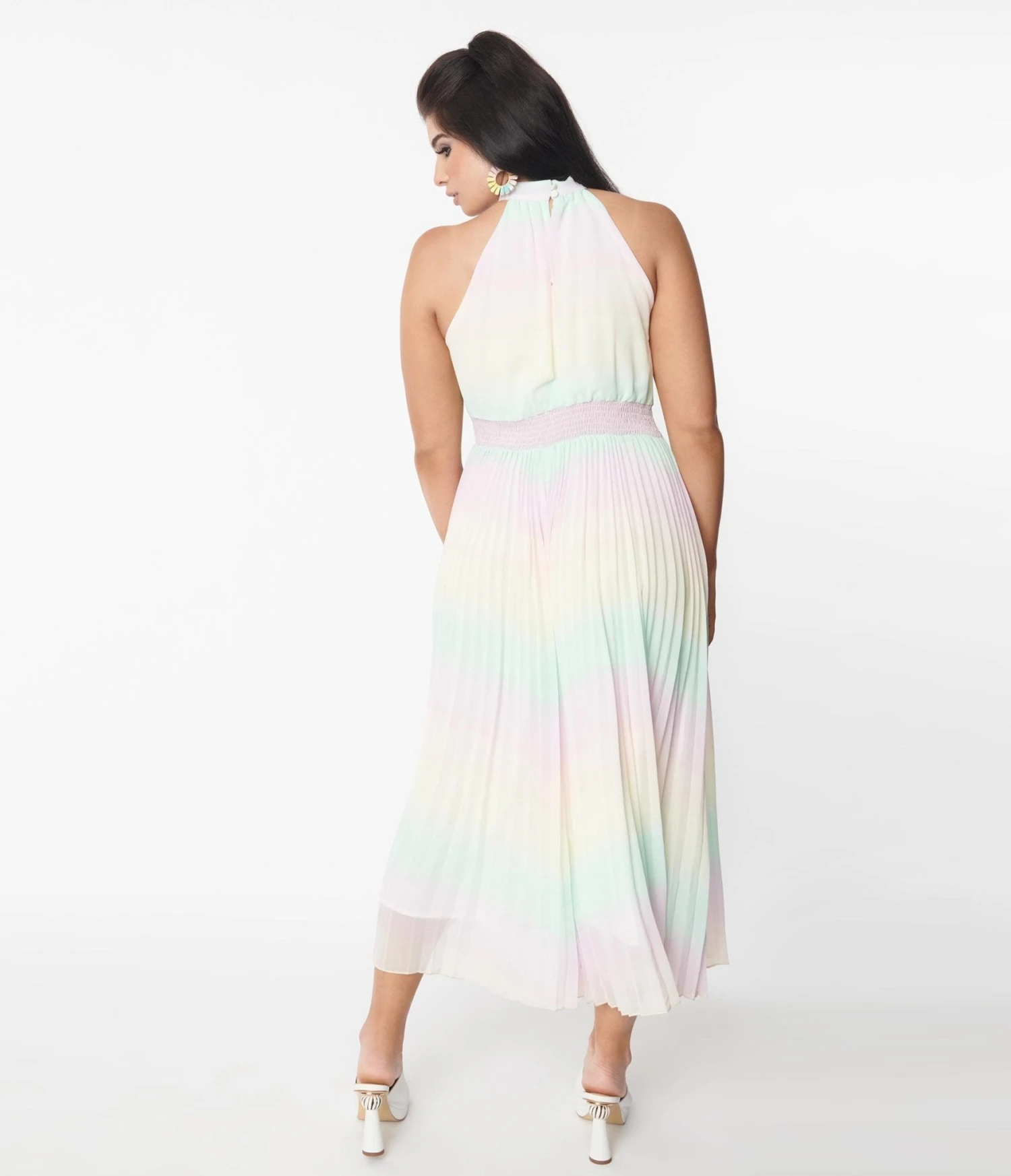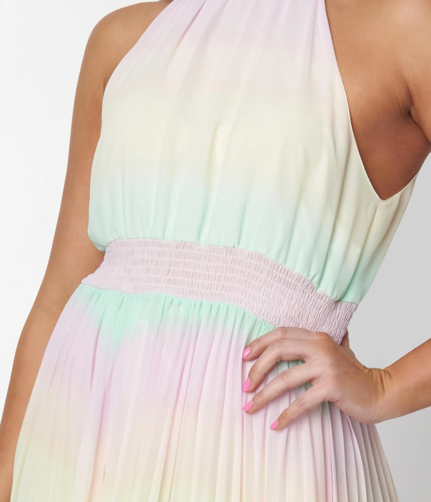 This lovely maxi dress is crafted in a striped pastel rainbow woven fabric and features a halter neckline with dual button closure. Complete with a smocked waist and pleated skirt with side pockets.