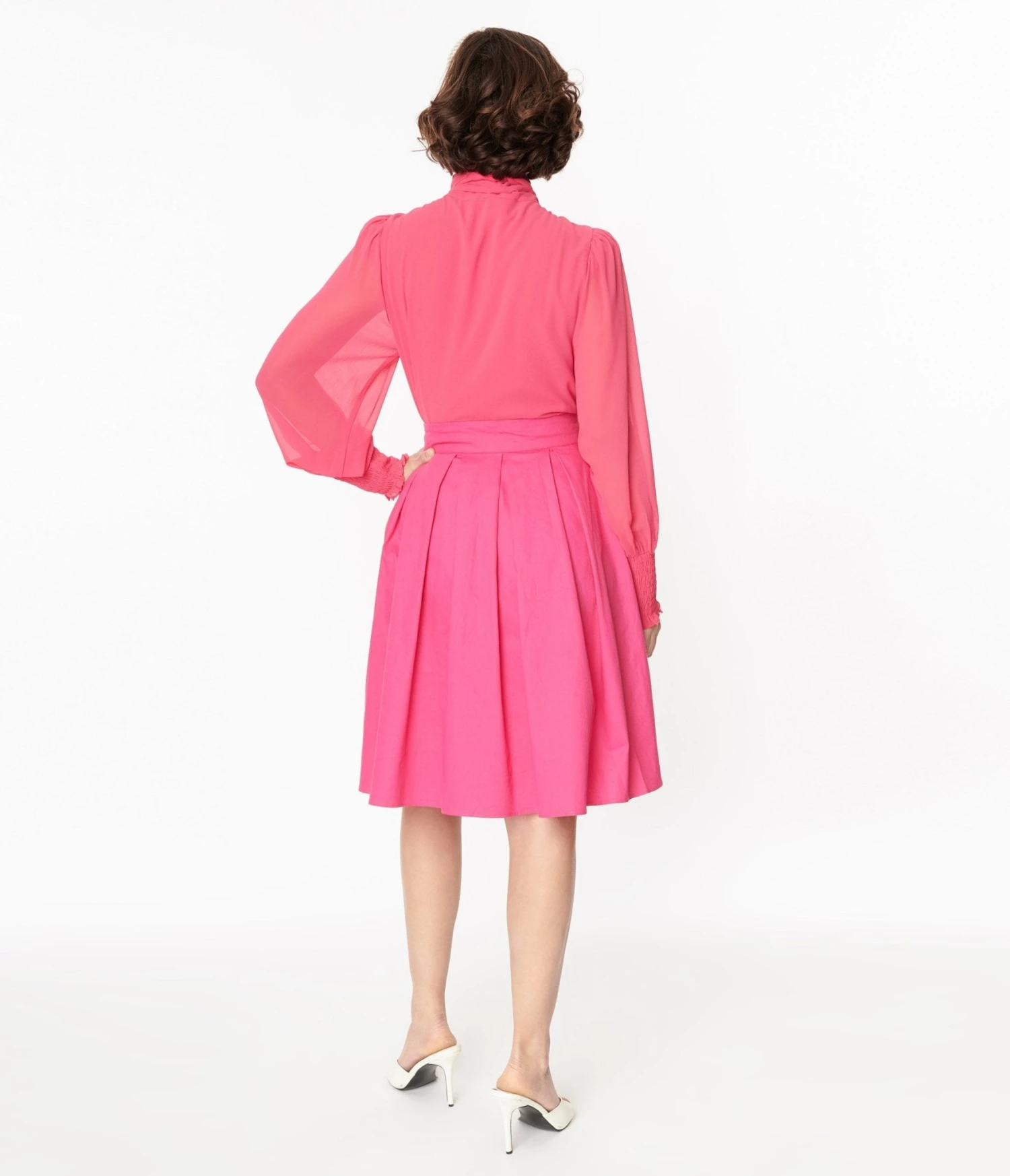 This 1950s style swing skirt is crafted in a pink woven cotton and features a side zipper, side pockets, and attached bow on the waist!