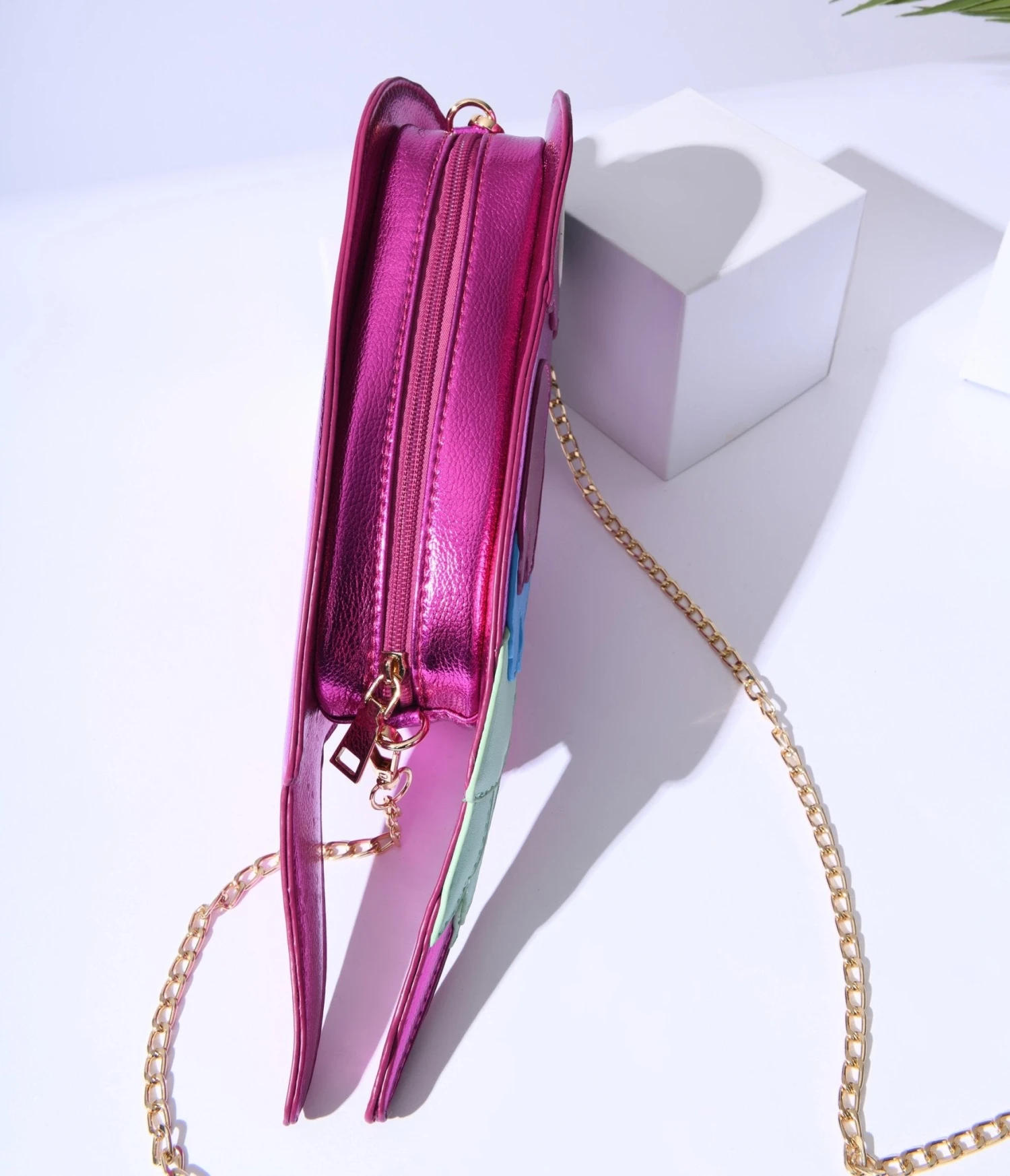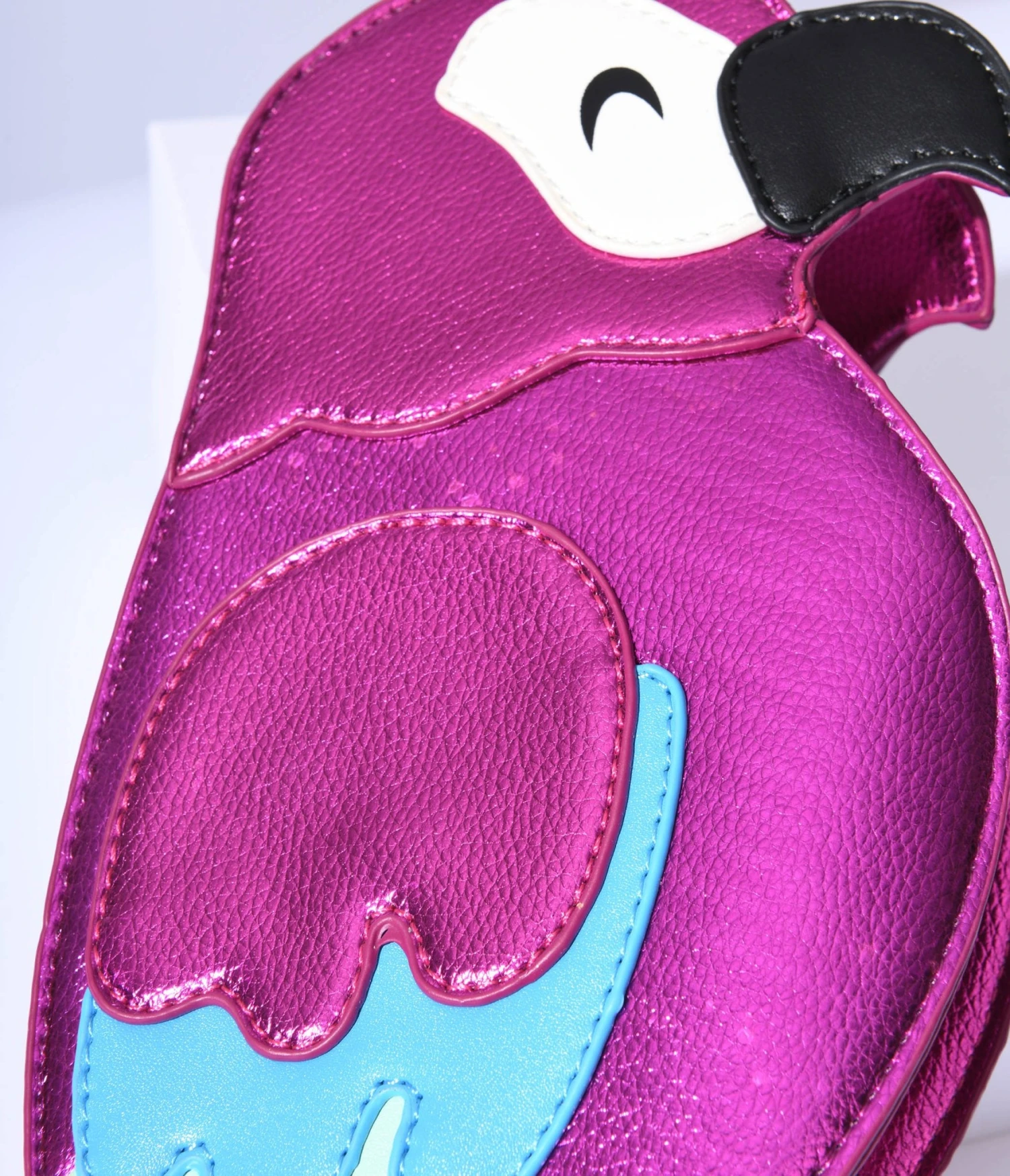 This darling crossbody bag is crafted in a metallic pink, blue, and green leatherette and set in the shape of a sweet parrot. Compete with top zipper and chain shoulder strap.