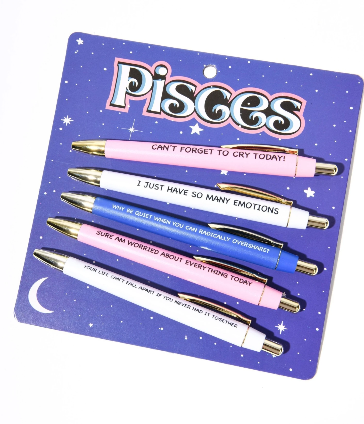 Get ready to add a touch of cosmic charm to your stationery collection with this Pisces Pen Set. This set includes five sleek black ink ballpoint pens in pink, blue, and white, each featuring a unique text inspired by your favorite zodiac sign.