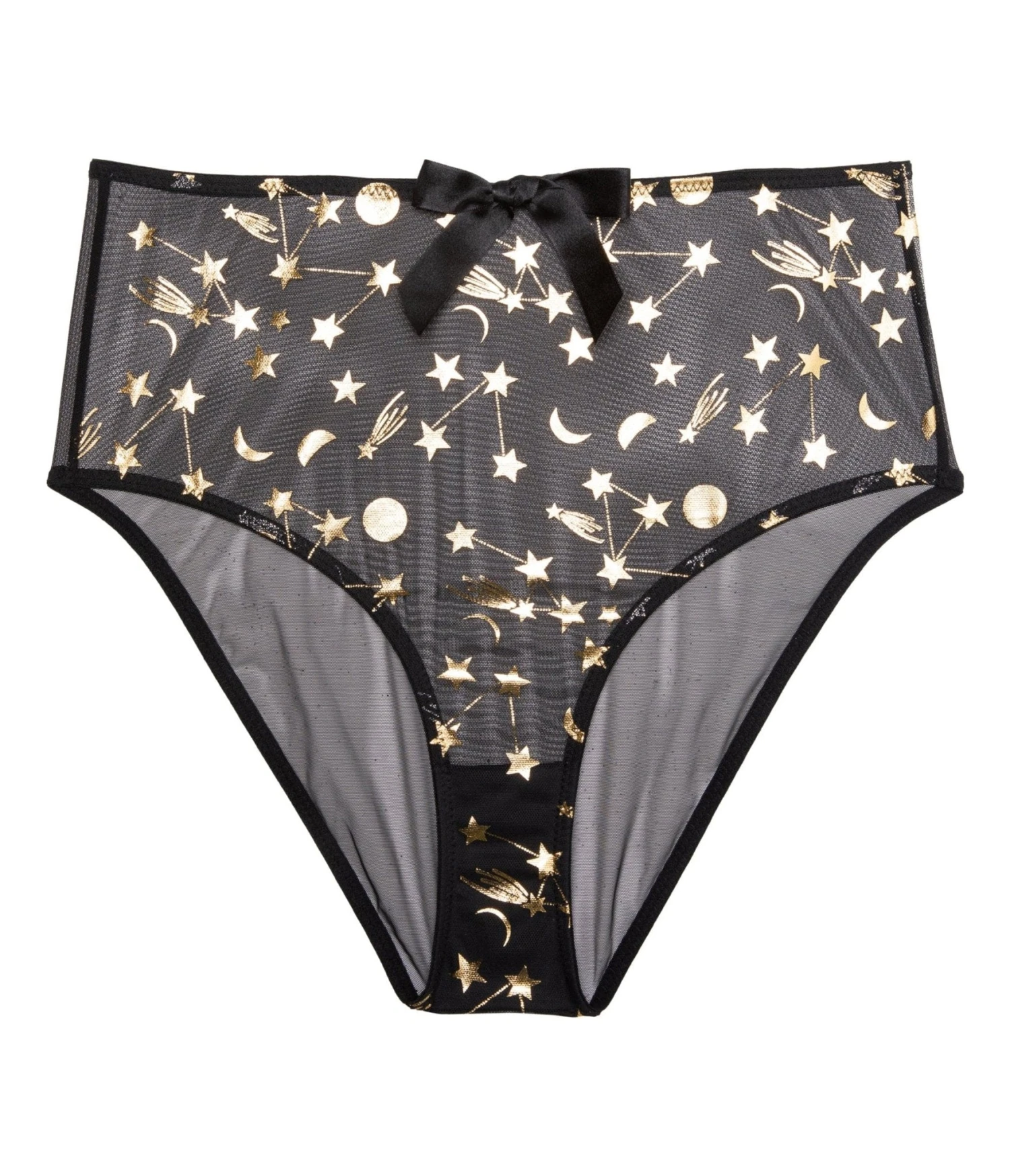These mesmerizing 1920s style briefs feature a daring combination of black mesh and an enchanting metallic gold cosmic overlay, making them perfect for all you fashion-forward souls out there. With their high waist design, these briefs offer both comfort and a flattering fit that accentuates your curves in all the right places. To add a touch of elegance, a satin bow sits at the center, adding just the right amount of glamour.