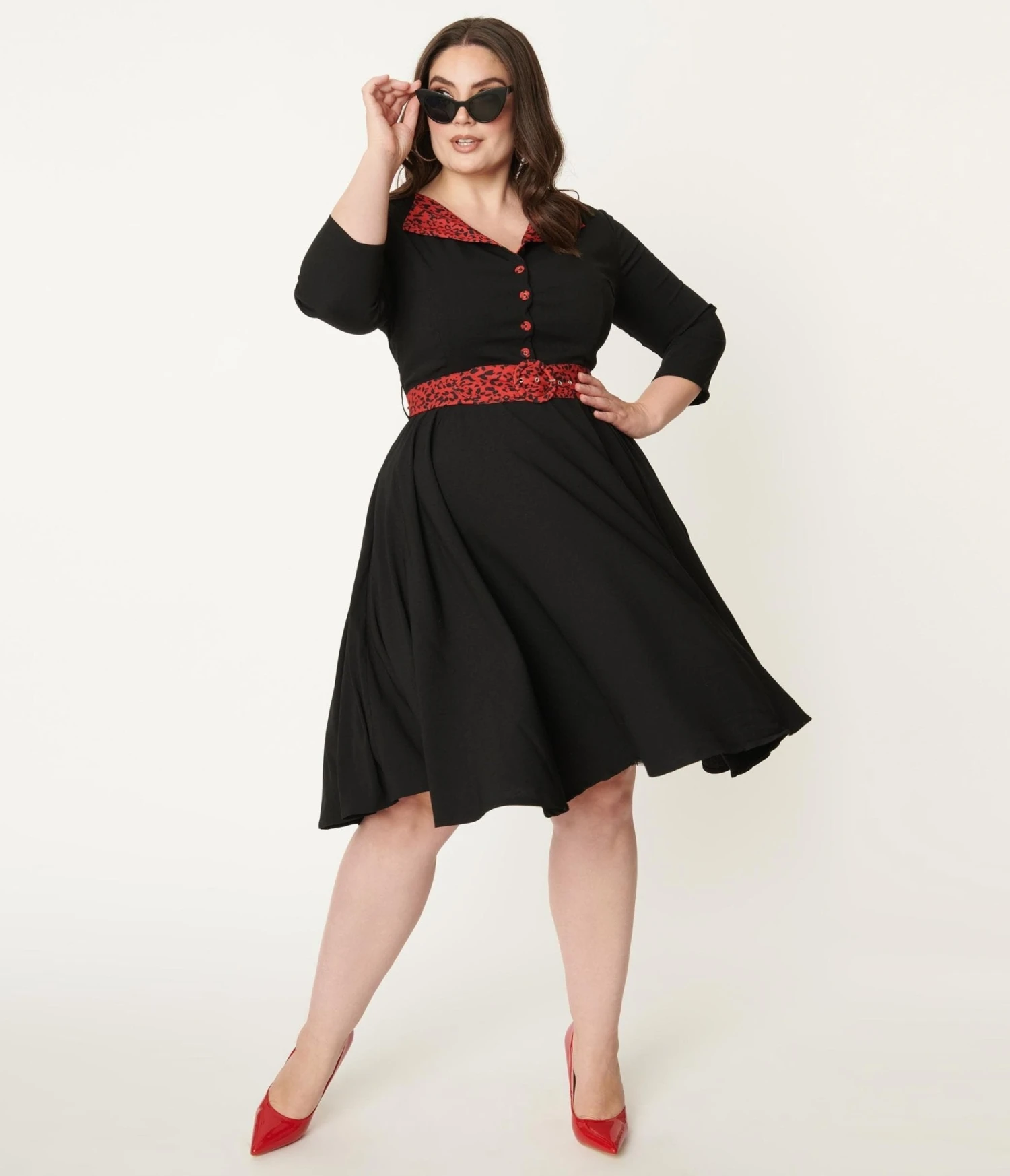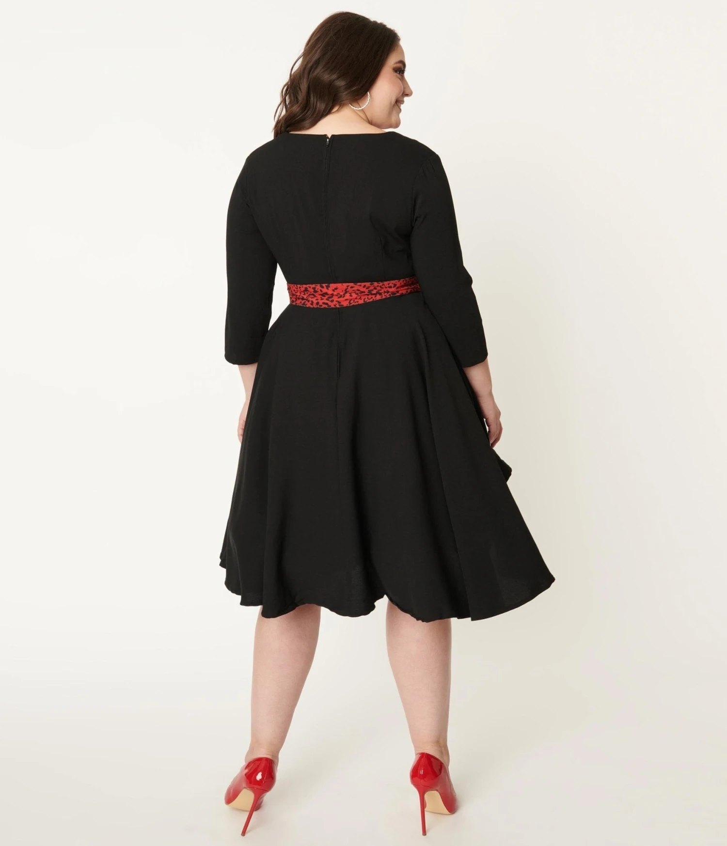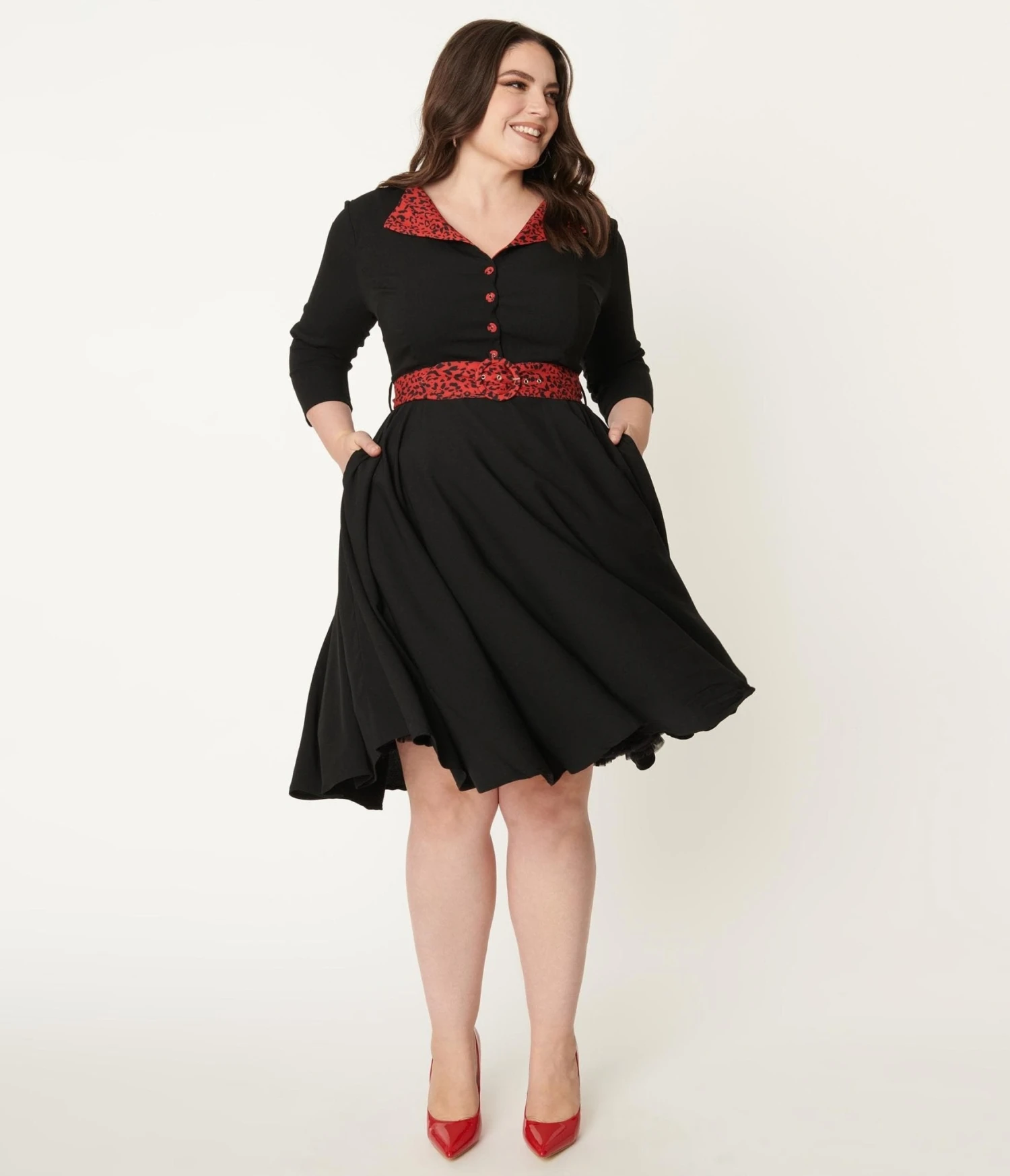 Jump in with open arms, dears! This marvelous mid-century inspired plus size piece is crafted in a sturdy woven crepe that excludes class in solid black. The button up bodice leads to a V-neckline, embellished with a red leopard print lapel and slender three-quarter length sleeves. The seamed waist is cinched with a back zipper and highlighted with a red leopard print belt while the sweeping swing skirt is outfitted with side pockets for modern function!