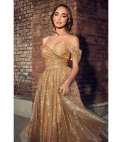 Cinderella Divine Gold Glitter Off The Shoulder Tea Length Dress