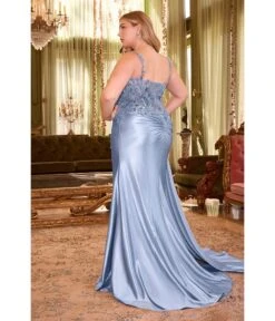 Cinderella Divine Plus Size Blue Glitter Tulle Off The Shoulder Applique Slit Gown