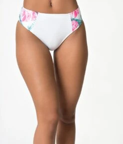 White & Pink Palm Leaf Print Bardot High Waist Brief Swim Bottoms