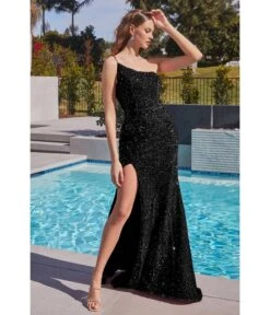 Cinderella Divine Black One Shoulder Velvet Sequin Bridesmaid Gown