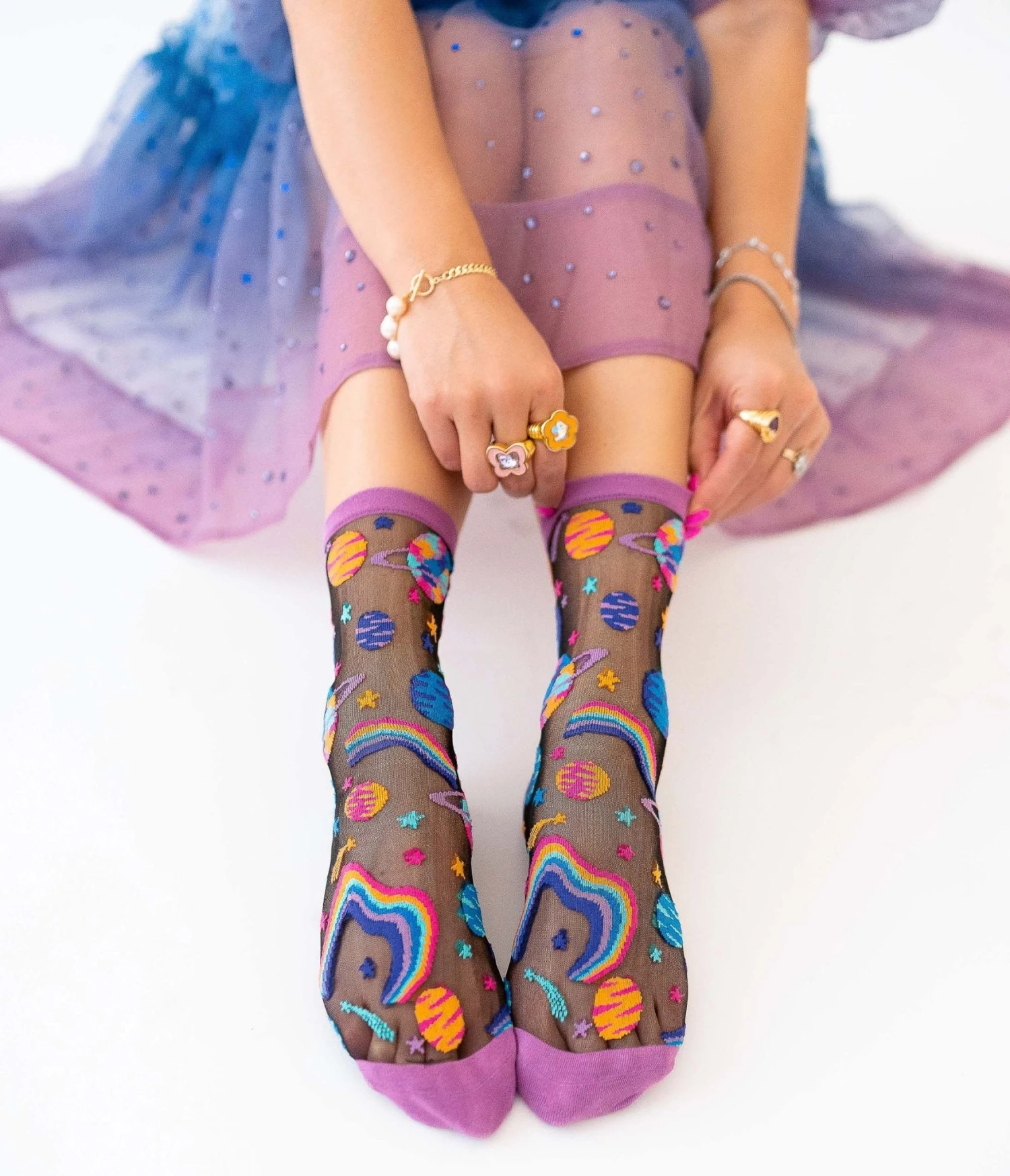 Inspired by pop art, these funky planets print sheer sock feature a variety of psychedelic planets, wavy rainbows, and shooting stars set against black sheer fabric. Bold, saturated colors give this sock a festival vibe and ensure your outfit makes a statement. Reinforced with a purple cuff and toe and a blue heel for the ultimate celestial themed accessory.