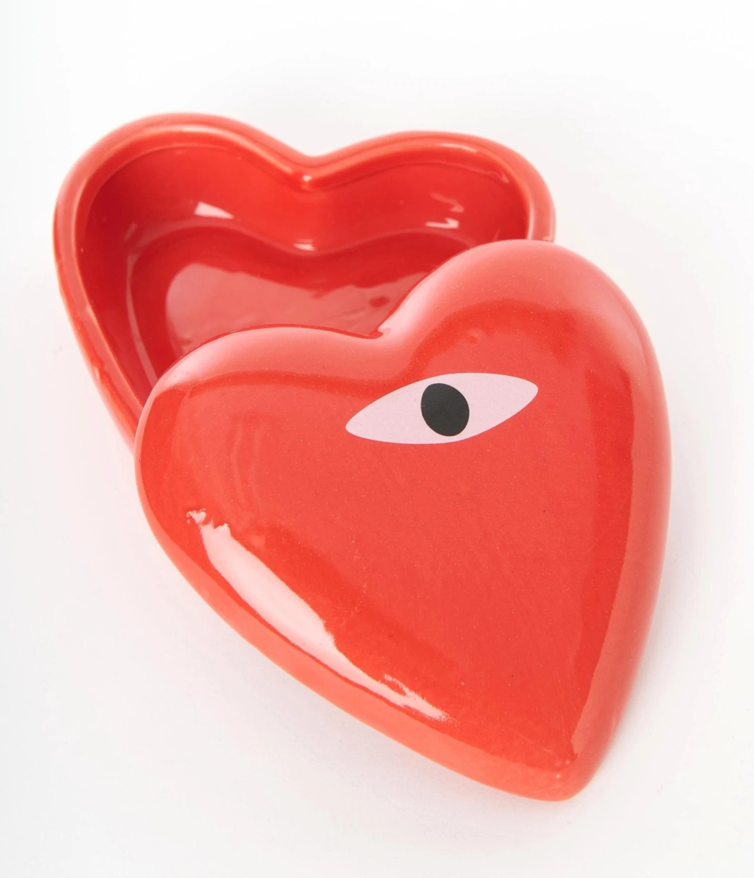 This sweet ceramic jewelry box is set in the shape of a heart and painted red and accented with a painted eye. Complete with a removable lid.