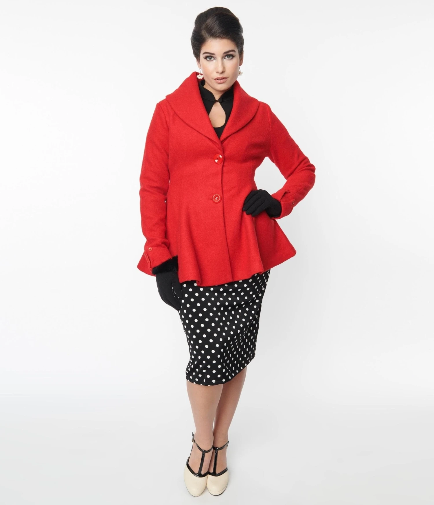 Sassy and sophisticated, this stylish skirted blazer is a must-have for your closet. Crafted with a red wool-blend that dances throughout the skirted silhouette. Complete with a button up front and side pockets for ease.