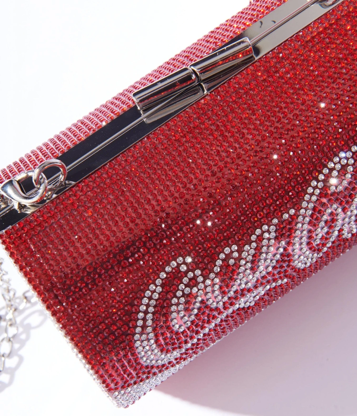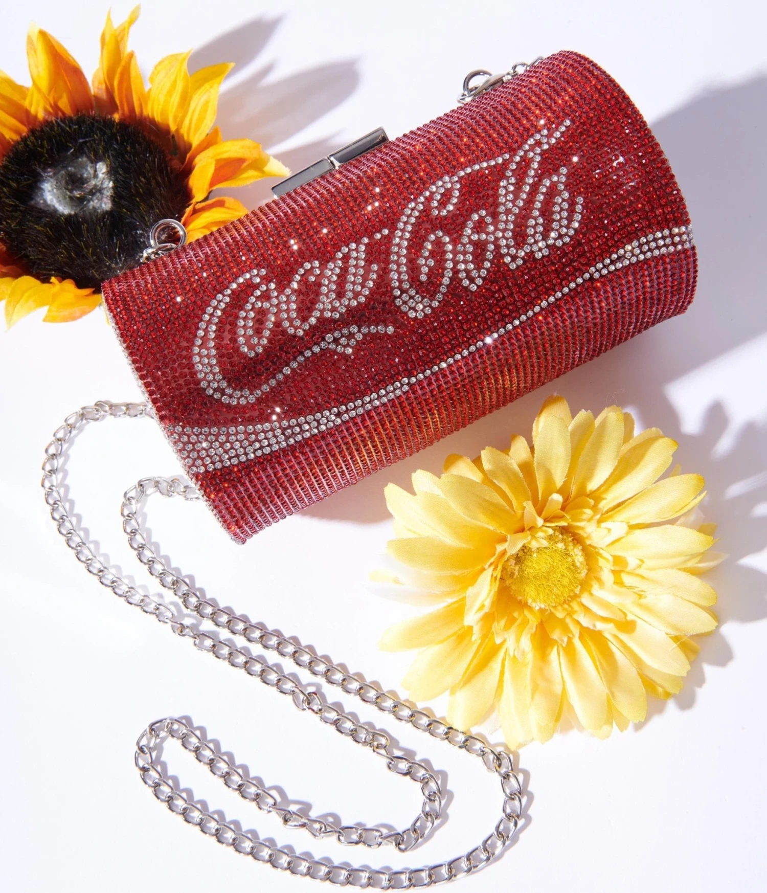 Red and silver Swarovski crystals. Coca-Cola can cylinder shape. Complete with snap closure and removable chain shoulder strap.