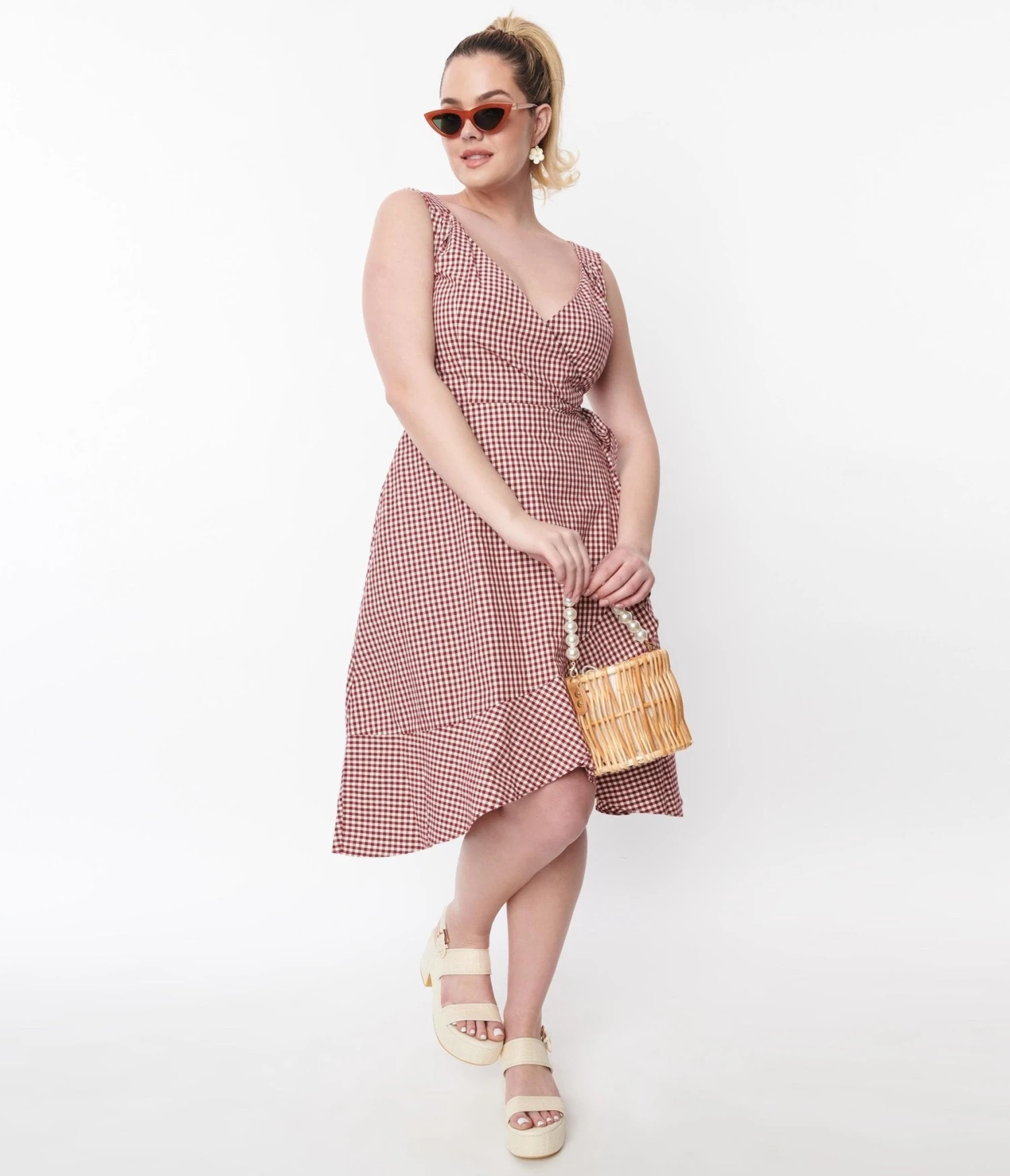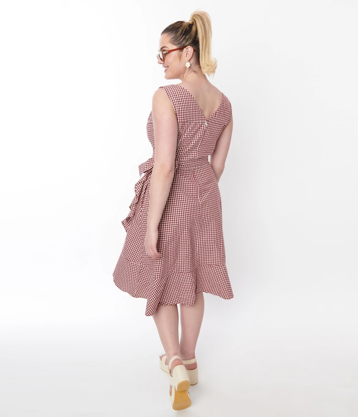 This lovely wrap dress is crafted in a red and white gingham woven fabric and features a sleeveless silhouette with a v-neckline. Complete with a self-tie back sash, back zipper and side pockets.
