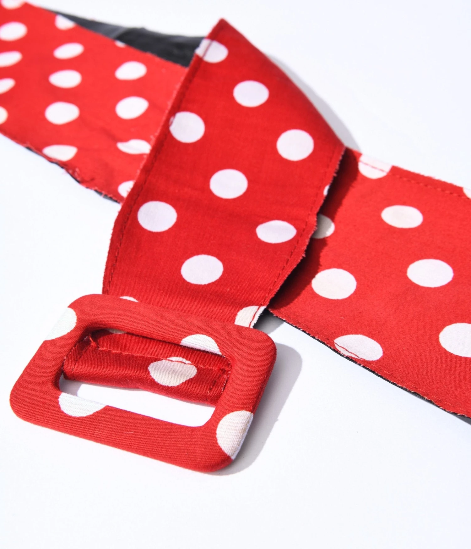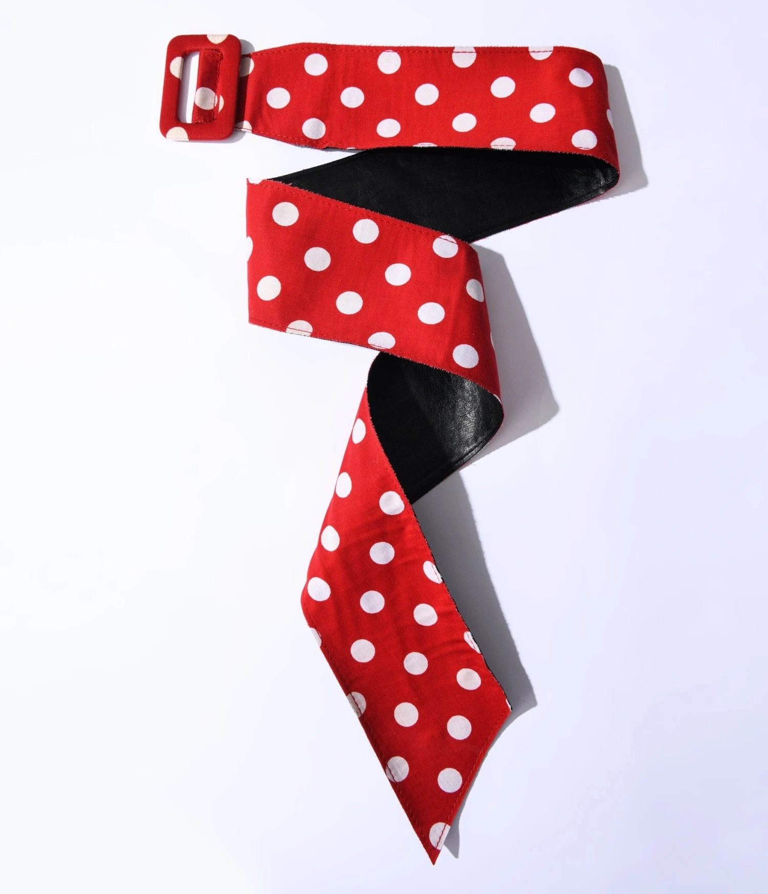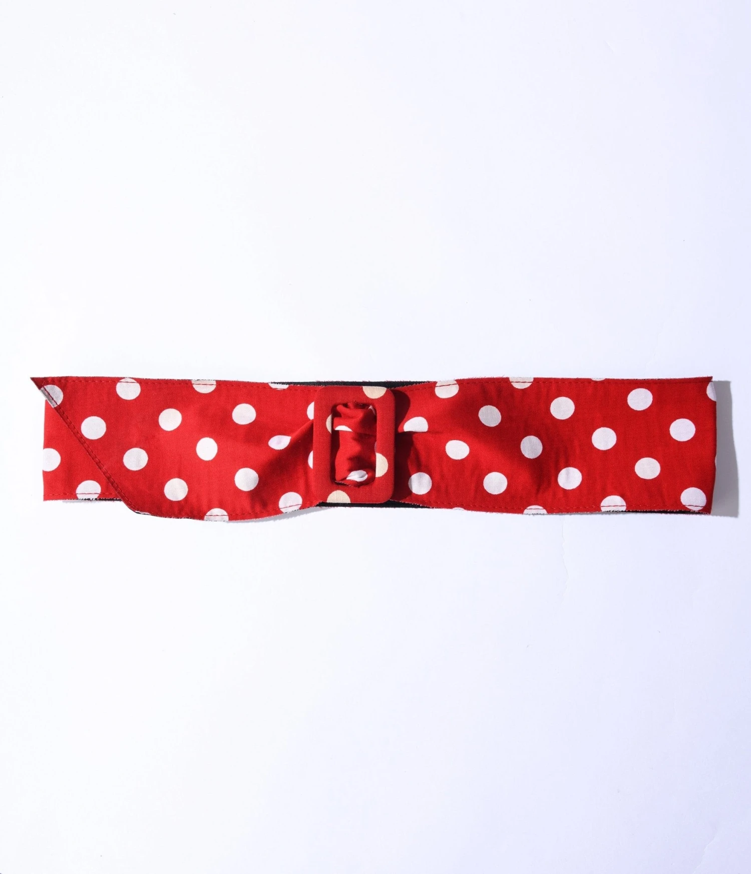 This darling belt is crafted in a red and white polka dot fabric and secured with a rectangular slide buckle.