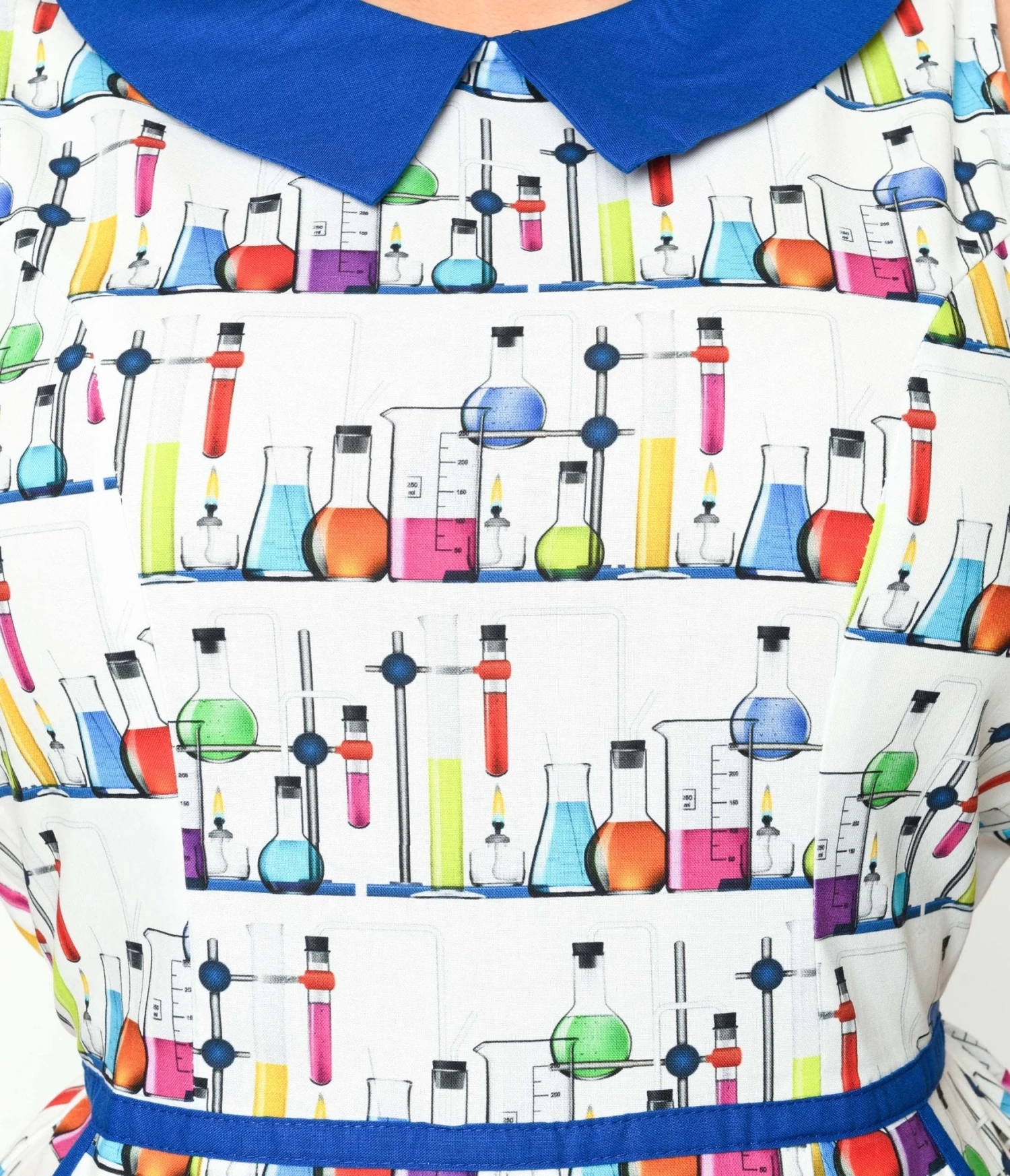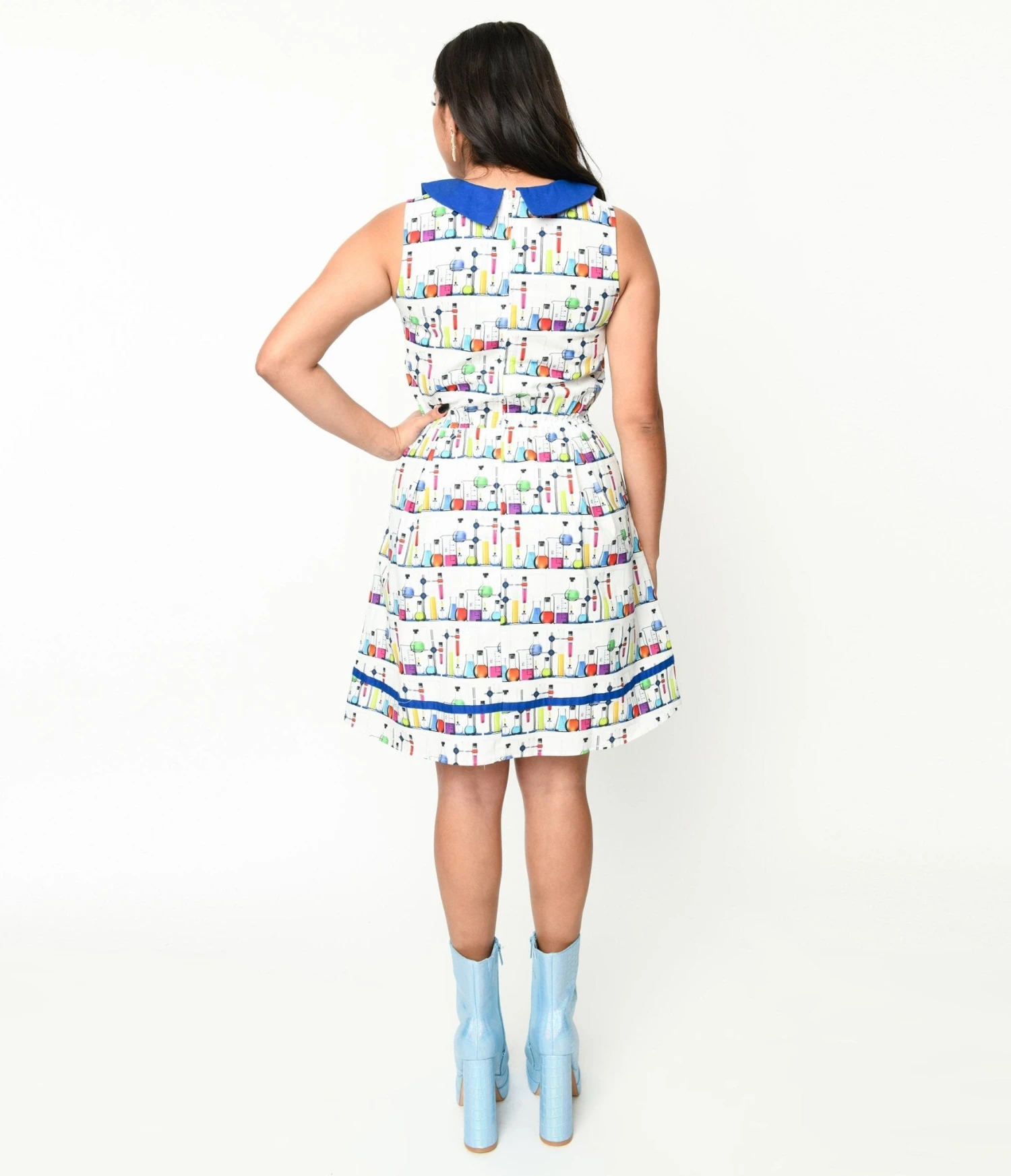 This white 1950s style fit and flare dress is far from boring, featuring eye-catching blue piping and a delightful blue contrast Peter Pan collar that adds a touch of whimsical charm. But here’s where it gets even better – this dress showcases an allover print of multicolor beakers and test tubes, making it perfect for science enthusiasts or anyone who wants to make a fashion statement. With its sleeveless design and convenient side pockets, this dress not only looks fabulous but also allows you to move freely throughout your day. The back zipper ensures easy wear without any hassle, so you can focus on being the stylish scientist that you are.