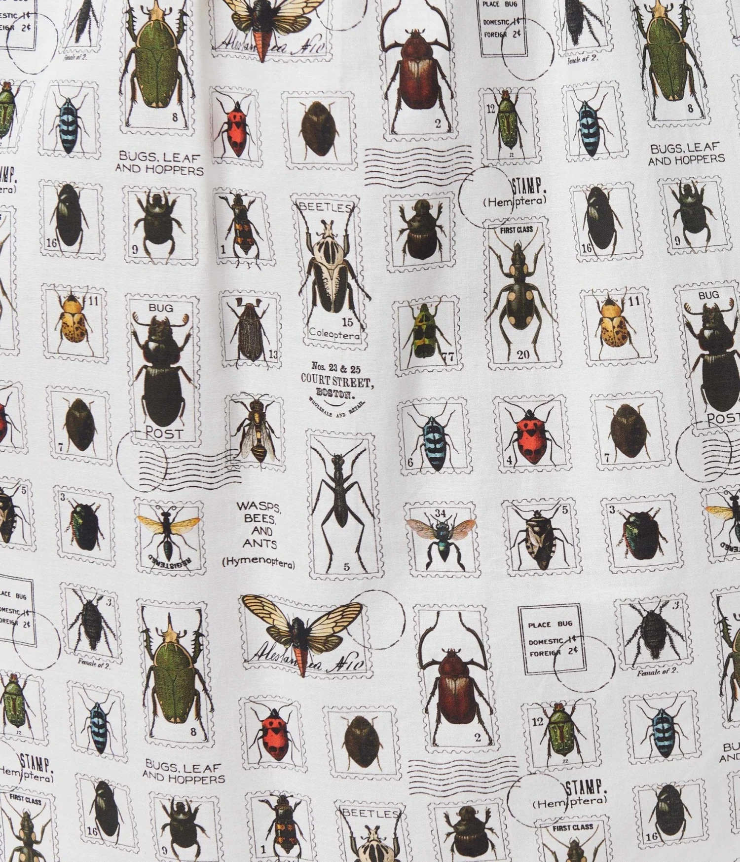 This spooky dress from Retrolicious is crafted in 100% Cotton and is crawling with a print of stamps with bugs throughout the off white backdrop. Complete with back zipper and side pockets.