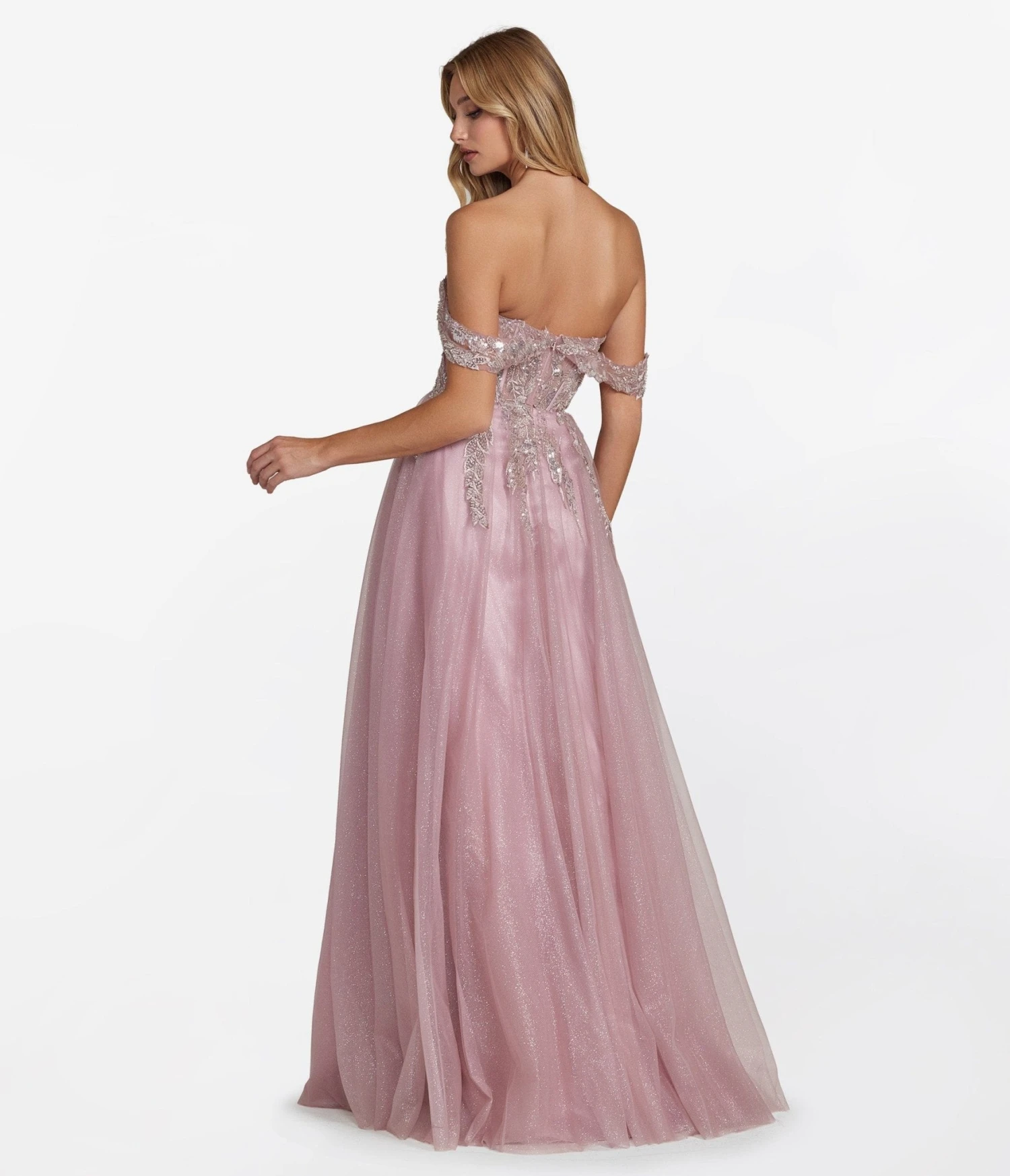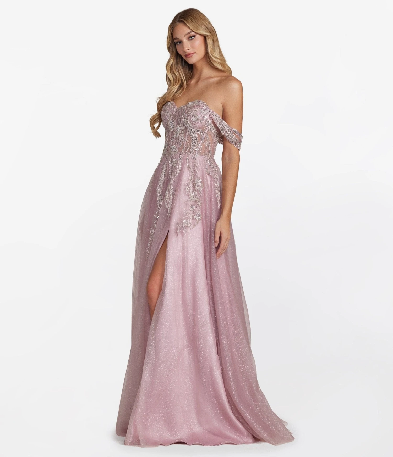 This gorgeous prom dress is crafted in a shimmering rose pink fabric. The semi-sheer corset style bodice is accented with floral embroidery and sequins that lead to the off the shoulder silhouette, while the full ball gown style skirt features a side slit.