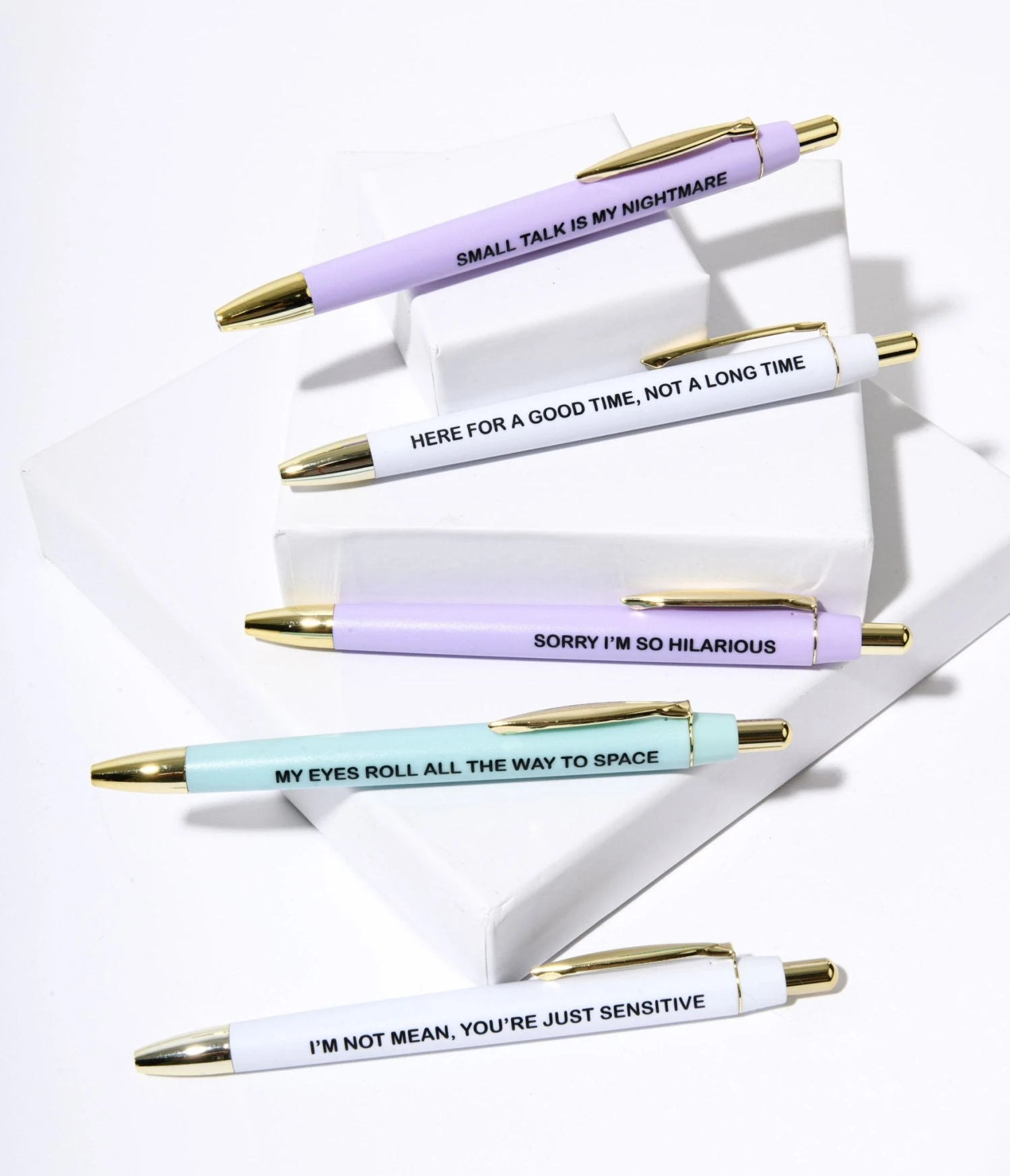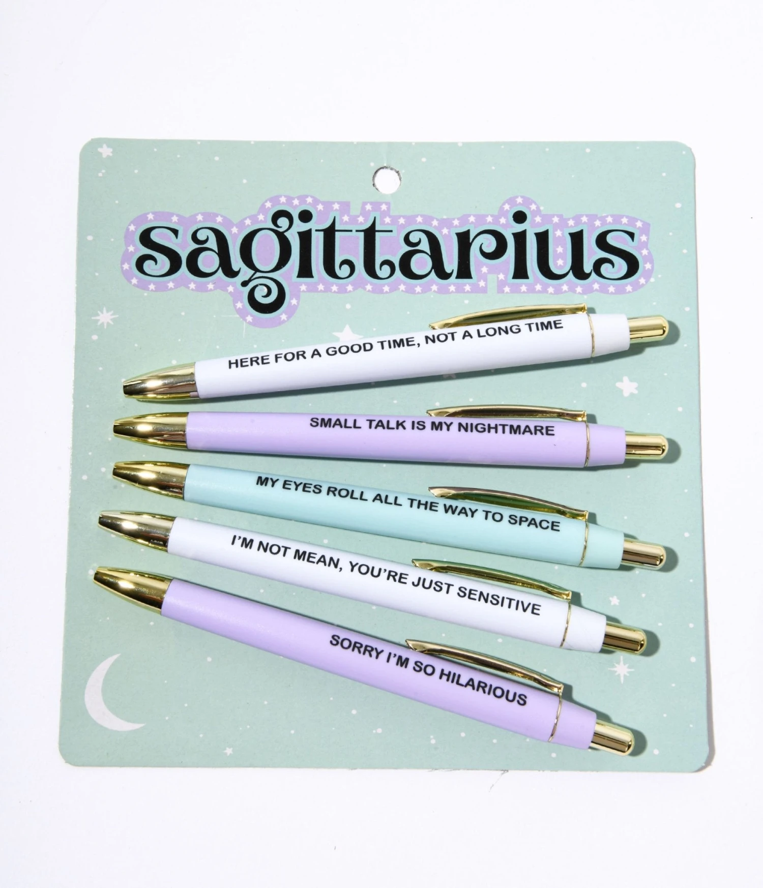 Get ready to add a touch of cosmic charm to your stationery collection with this Sagittarius Pen Set. This set includes five sleek black ink ballpoint pens in purple, blue, and white, each featuring a unique text inspired by your favorite zodiac sign.