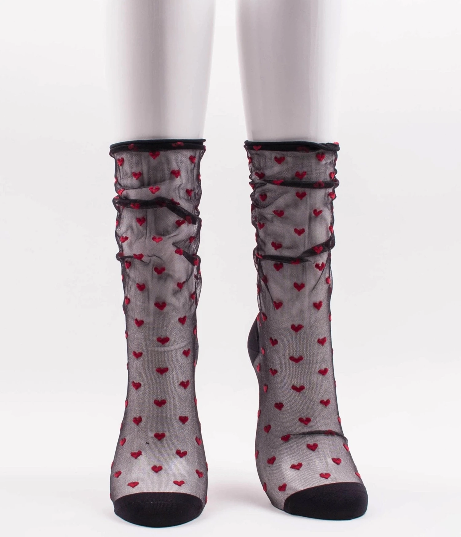 These sweet crew socks are crafted in a sheer black mesh accented with flocked red hearts throughout.