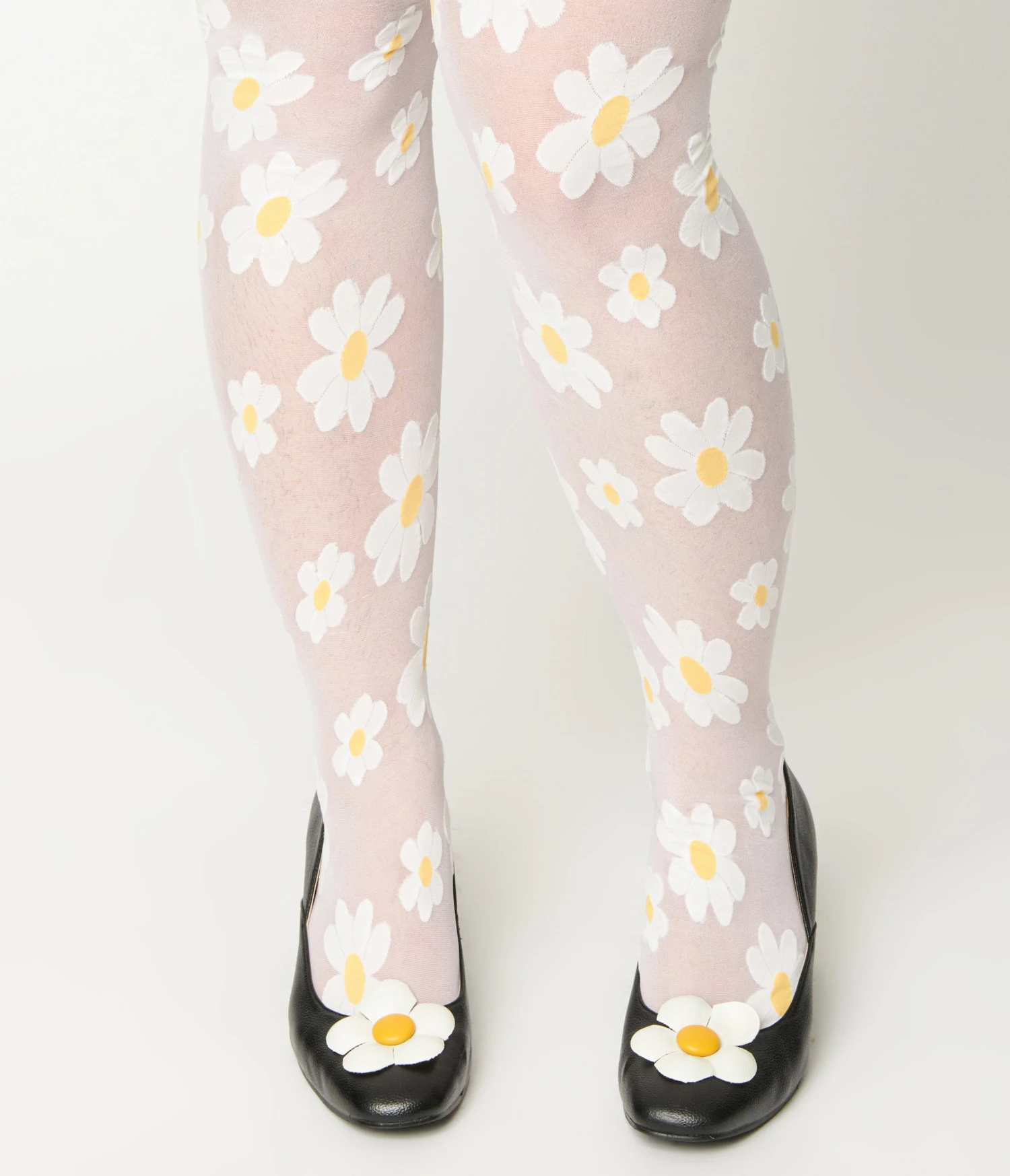 Get ready to embrace your inner flower power! These delicately designed tights feature an alluring white sheer fabric adorned with enchanting white daisies, adding a touch of whimsy and femininity to any outfit.