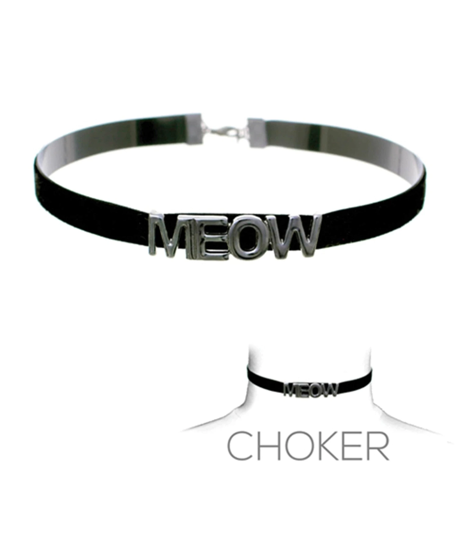 This choker’s the cat’s meow! Boasting silver letters with the text ‘MEOW’ with a black collar. Complete with a lobster clasp.