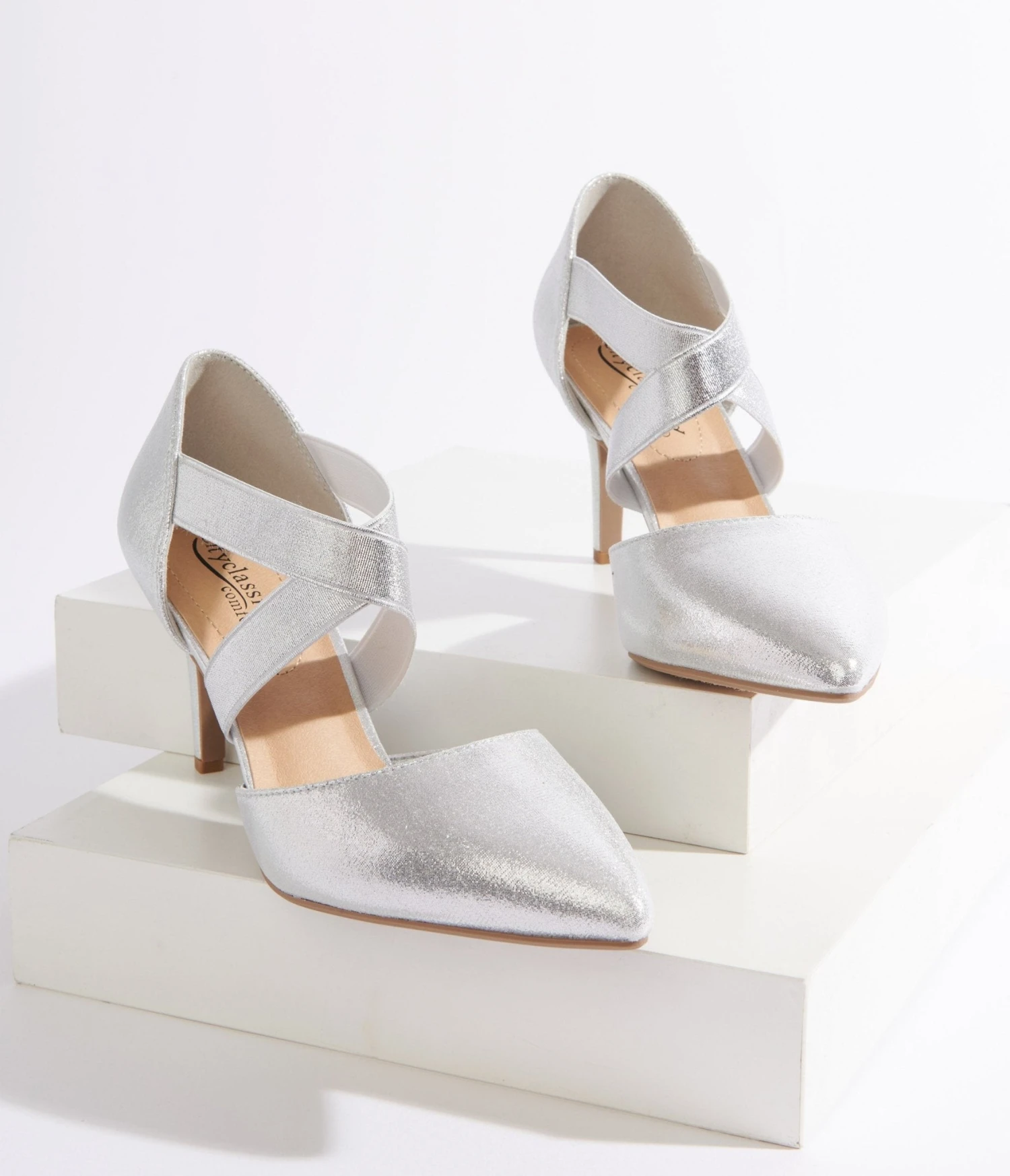 These stunning heels are crafted in a shimmering silver fabric and feature elastic cross front straps and 3.25 inch heels!