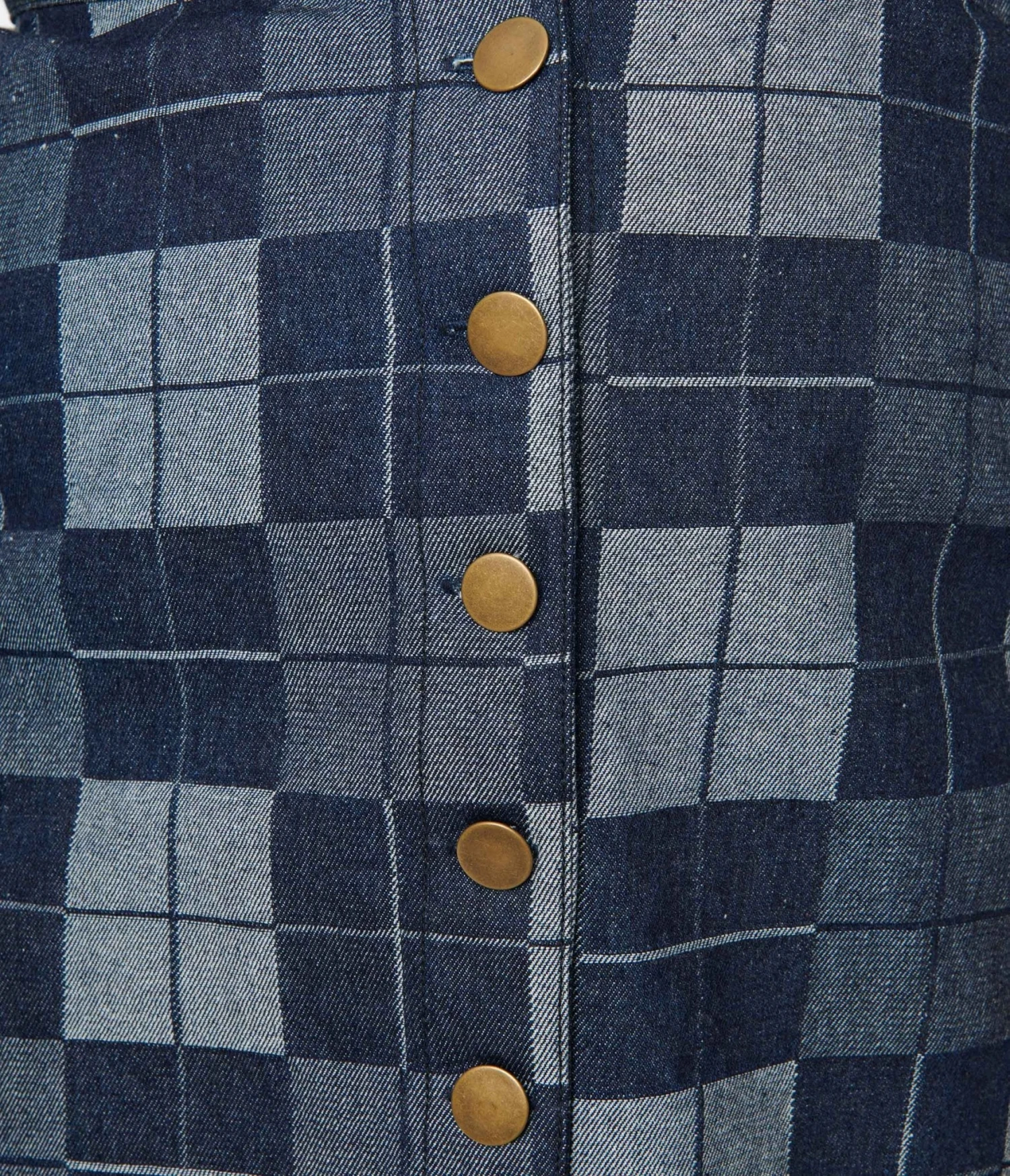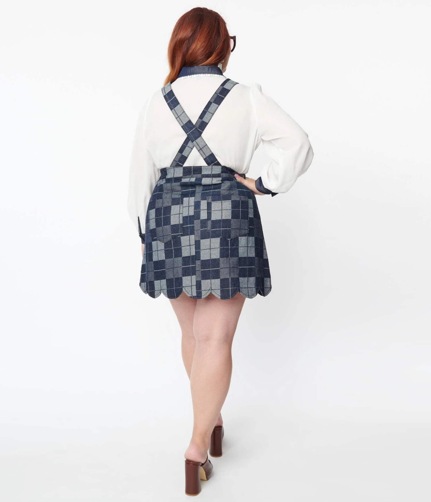 This flirtatious plus size mini skirt is crafted in a fabulous denim boasting dark and light denim checks throughout, outfitted with a button up front, removable button adjustable suspender straps, and back pockets!