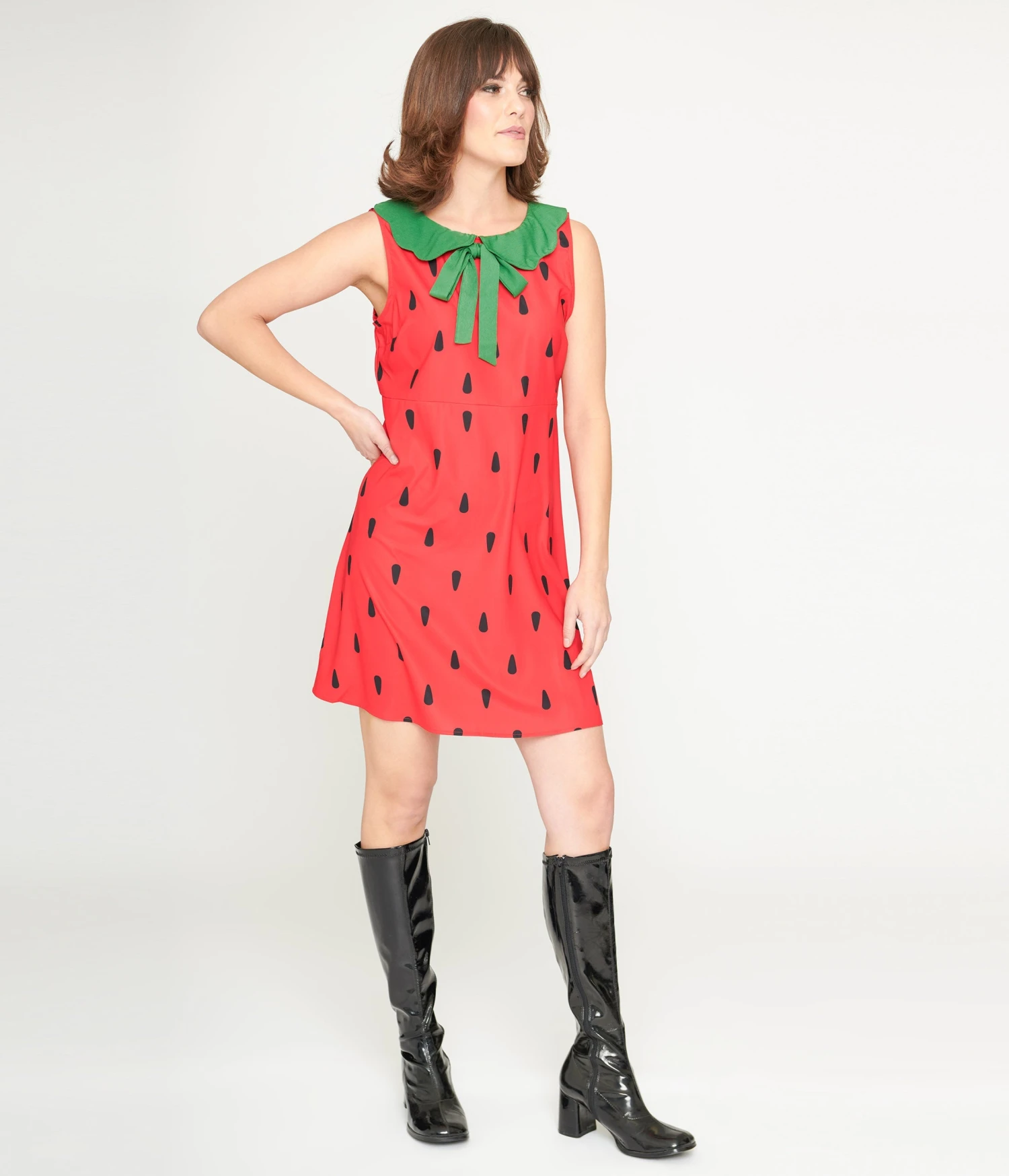 This adorable 1960s shift dress from Smak Parlour features a playful combination of red and green colors, resembling a juicy strawberry. The back zipper ensures easy on-and-off, while the scalloped collar adds a touch of feminine charm. You can customize your look by tying the self-tie collar in a cute bow or leaving it loose for an effortless vibe. With its sleeveless design, this dress is perfect for sunny days or layering with cozy cardigans during colder months. Made from high-quality woven fabric, this strawberry shift dress guarantees both comfort and style all day long.