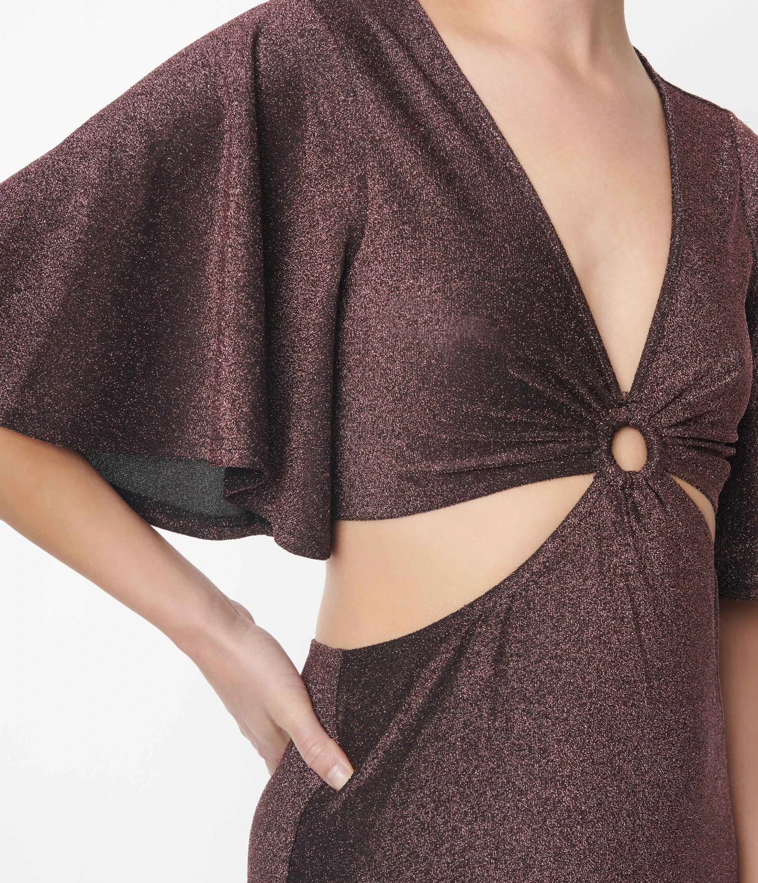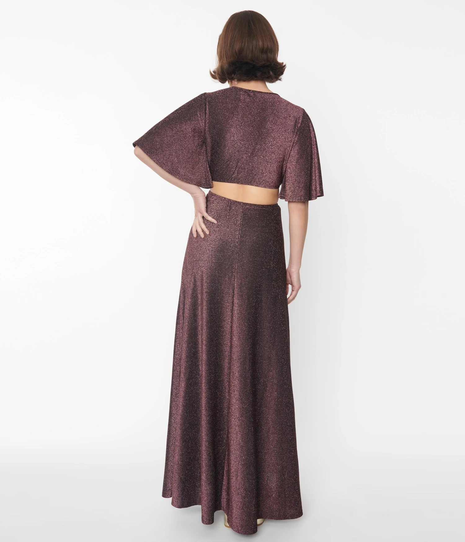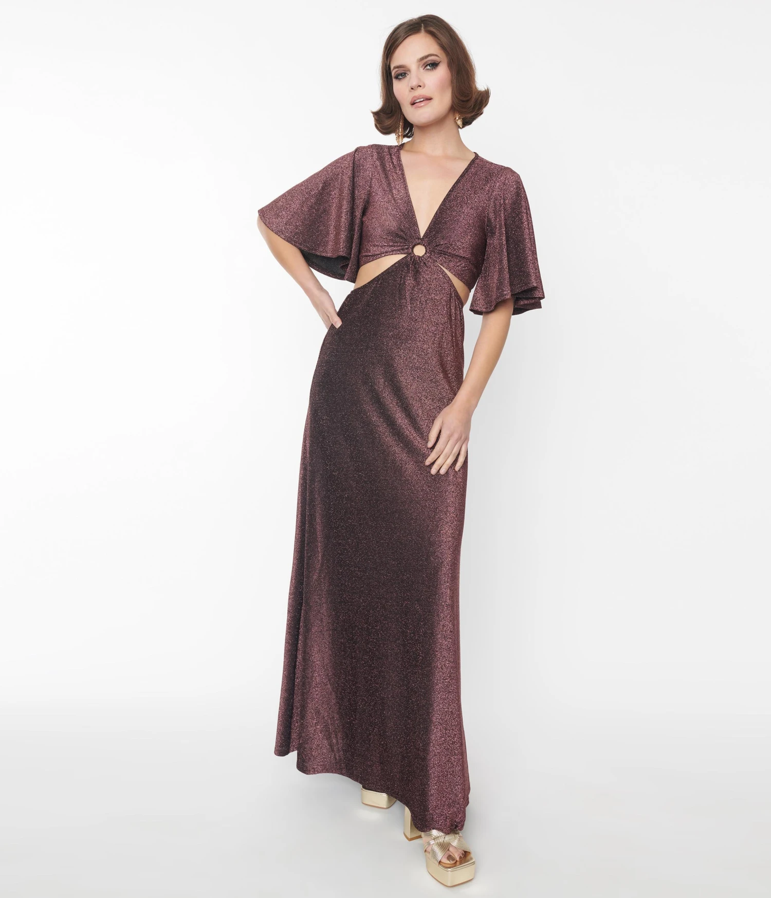 Glide on the dance floor with this fabulous 1970’s style maxi dress from Smak Parlour, crafted in a shimmering rose pink and black lurex knit that features a short sleeve silhouette with a cutout detail on the sides and lower back. Boasting a deep v-neckline that leads to a ring detail on the bust.