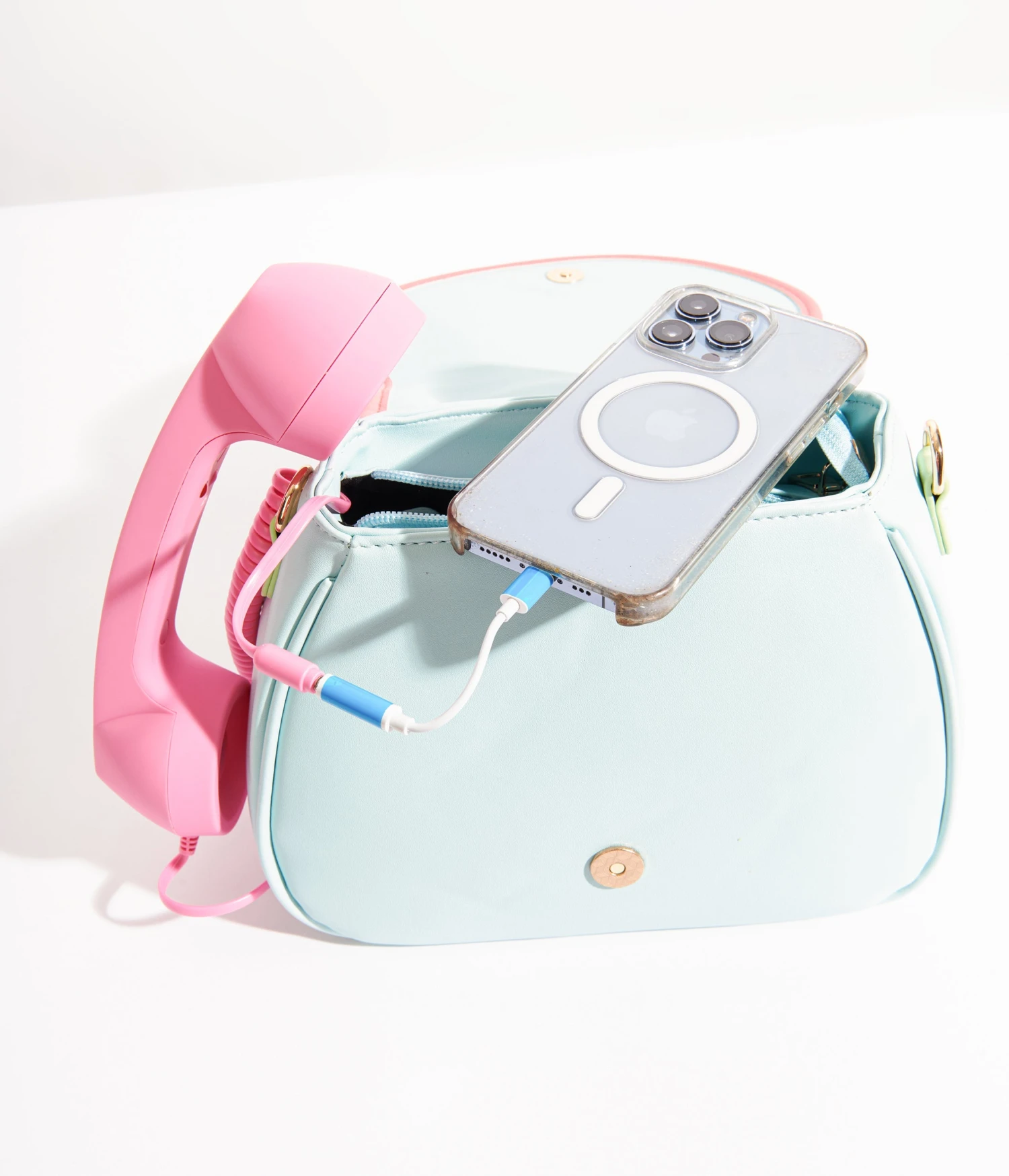Step back in time with this retro-inspired delight that will transport you to an exciting era! Crafted from light blue leatherette adorned with a playful pink and strawberry pattern flap, this handbag is the epitome of chic nostalgia. Its heart dial adds a touch of whimsy while the fully functional pink phone handle allows you to make (or receive) calls through the included headphone jack, making it both stylish and practical. Need versatility? No problem! This amazing bag can easily be converted into a crossbody or backpack, giving you endless options for hands-free fashion. Complete with a magnetic snap closure, top zip, and inner zip pocket.