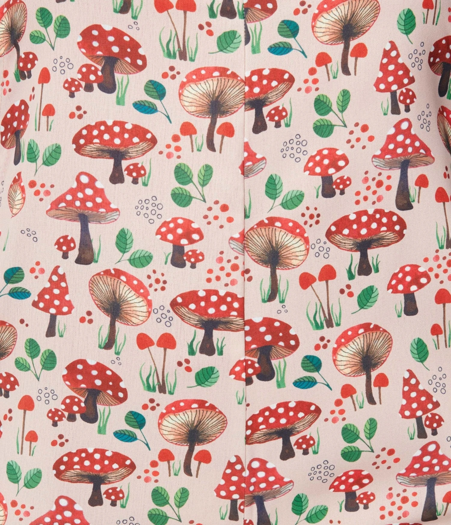 This whimsical jumpsuit is crafted in a tan lightweight woven fabric that features red mushrooms throughout. Featuring suspenders secured with front buttons and capri length, wide leg pant. Complete with side pockets.