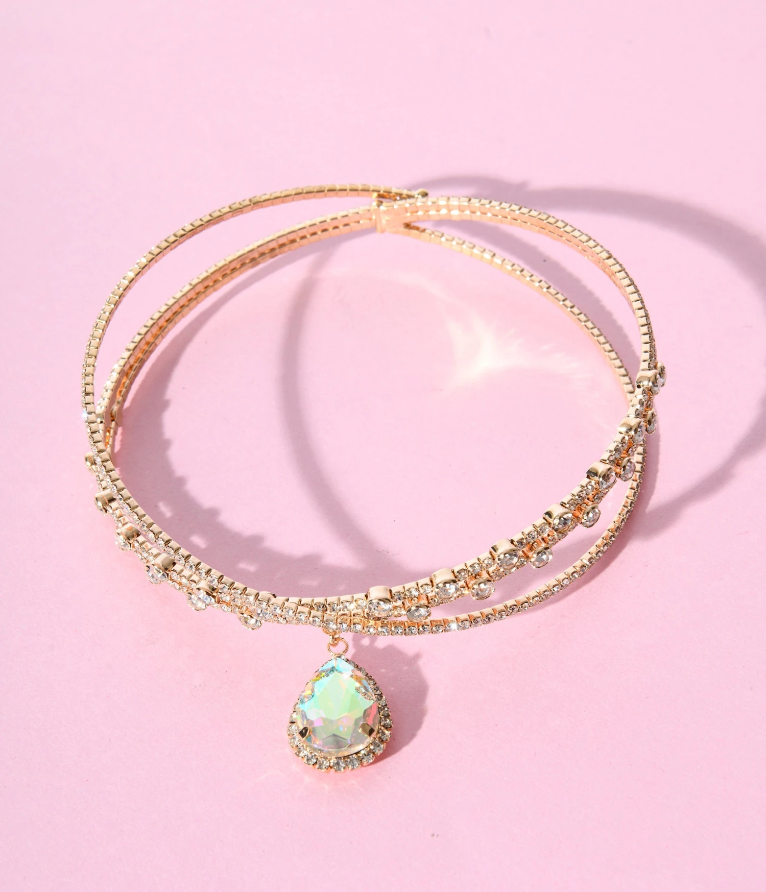 With its exquisite crystal teardrop pendant and shimmering silver rhinestones, this accessory is elegance redefined. Perfect for adding a touch of vintage glamour to any outfit, the gold hue adds a classic 1920s twist that will transport you back in time. Its comfortable choker-style design ensures a snug fit without compromising on style or comfort.