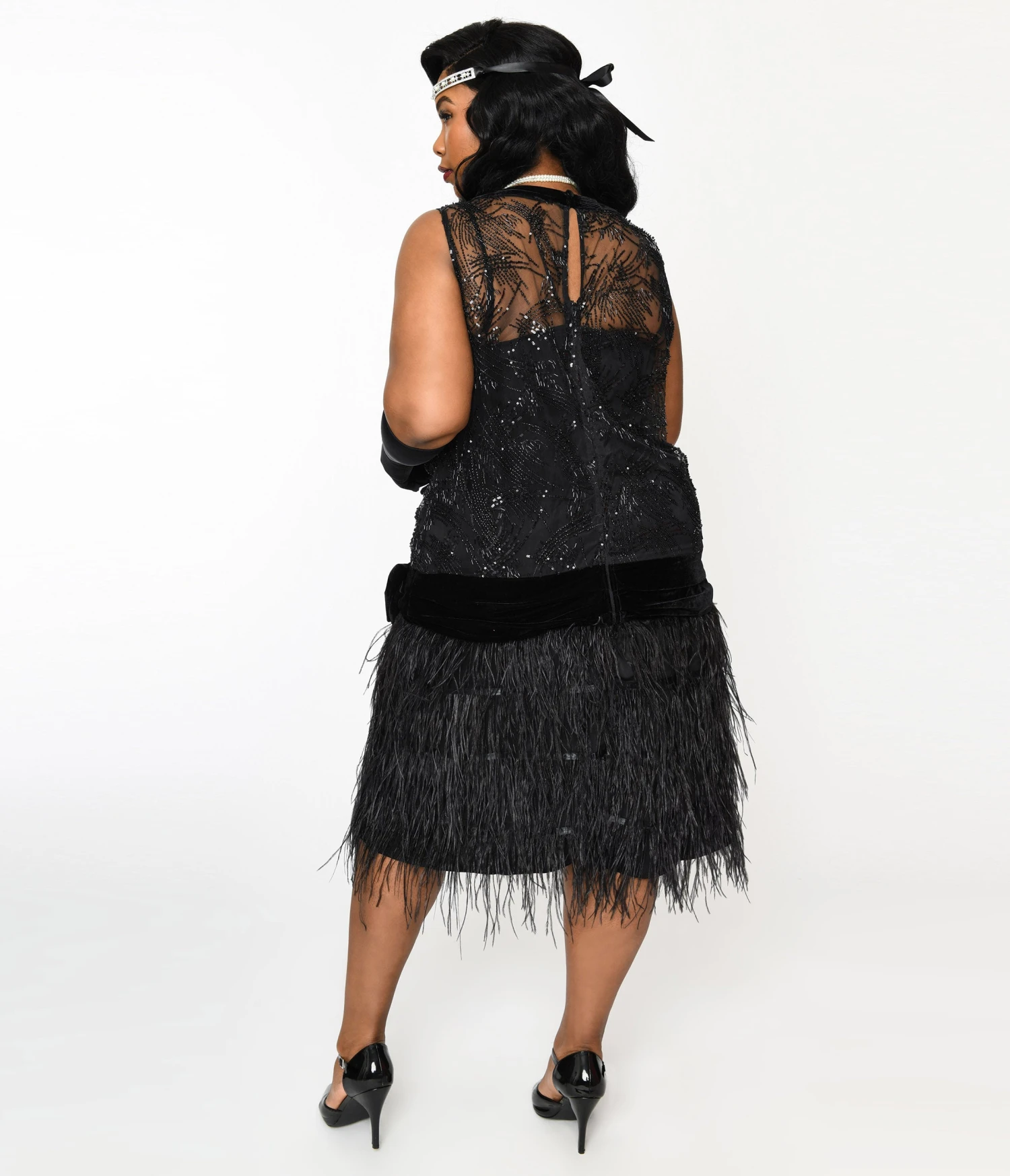 Step into the glamour of the roaring twenties! This exquisite 1920s inspired plus size flapper dress, in collaboration with The Great Gatsby, is a feast for the eyes, featuring shimmering black beaded sequins on sheer mesh that will make you shine bright all night long. The sleeveless design adds a touch of elegance while the velvet lined surplice neckline drops to below the waist, accentuated by an attached velvet bow that ties it all together flawlessly. As you dance and twirl, feel the feather tiered skirt swish and sway around you, adding movement and drama to your every step. With a back button keyhole and zipper closure, getting in and out is effortless.