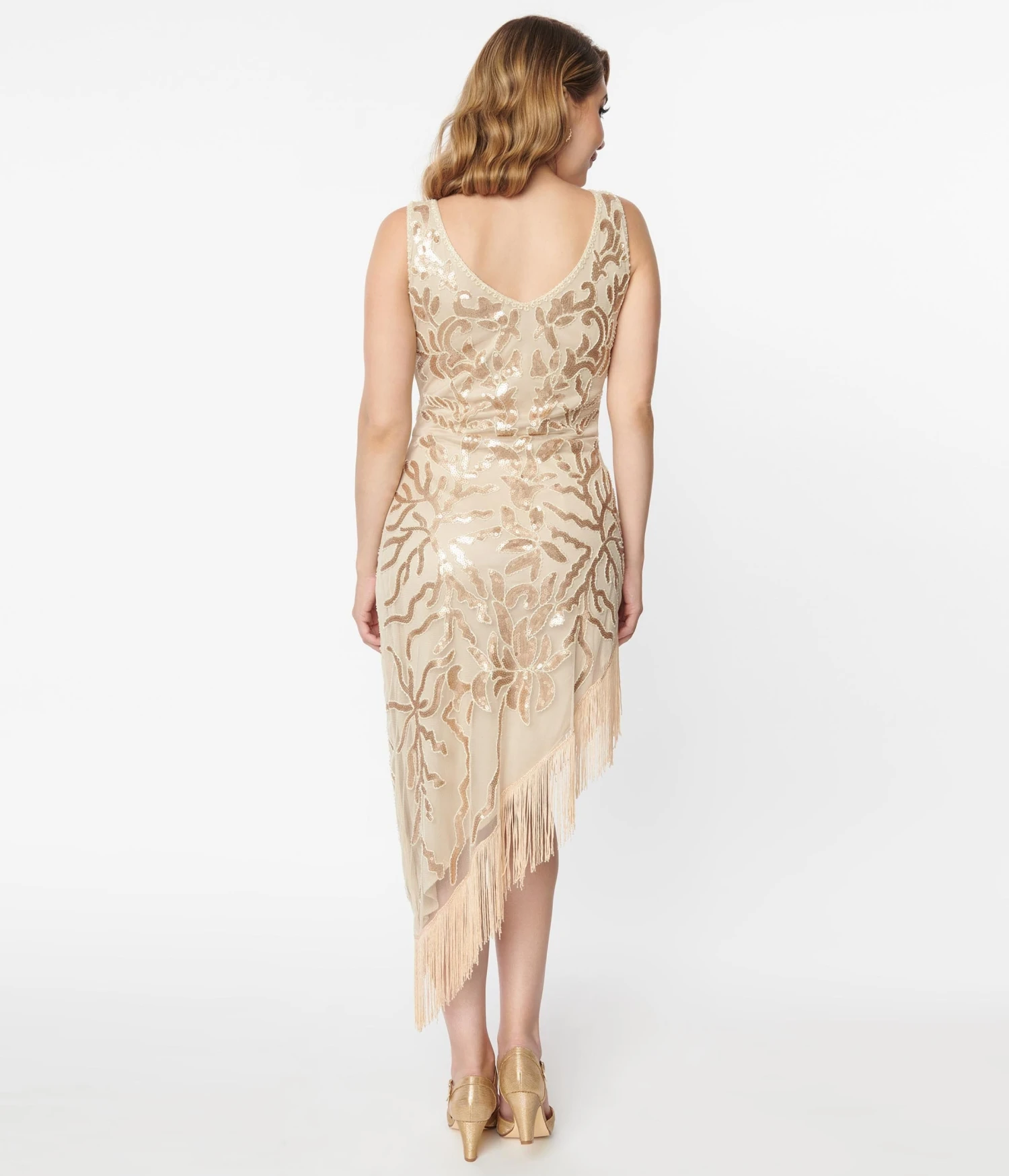 A heart-stopping silhouette full of 1920s styling, this bewitching flapper dress from Unique Vintage is crafted in beige mesh that sparkles with champagne sequins and beading over beige lining. The sultry V-neckline is framed by a sleeveless design while the tapered waist is cinched with a side zipper. The sexy asymmetrical fitted skirt starts at a jaw-dropping high and cascades past the knees with long beige fringe!