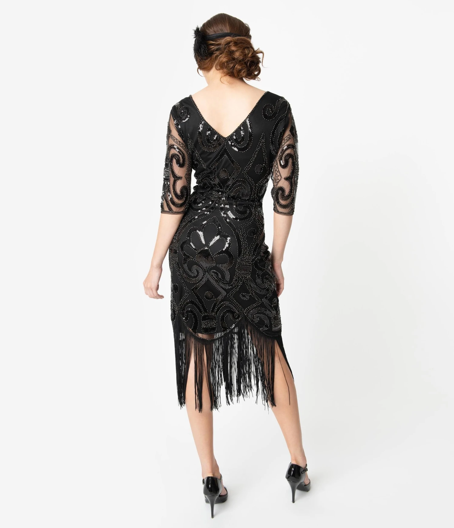 Give them a little swagger, dames! The 1920s are roaring back in this stunning gown from Unique Vintage, boasting flapper sensibilities with modern fabulousness. The Lynette Flapper Dress boasts beautiful black mesh over black knit lining for a sultry silhouette that dazzles with gunmetal beading and black sequins. The elegant V-neckline is framed by sheer half sleeves while the tapered waist flatters your hourglass and drops into a fabulous fitted skirt that dances with a scalloped hem and long black fringe. Outfitted with a side zipper, it’s a Gatsby sashay!
