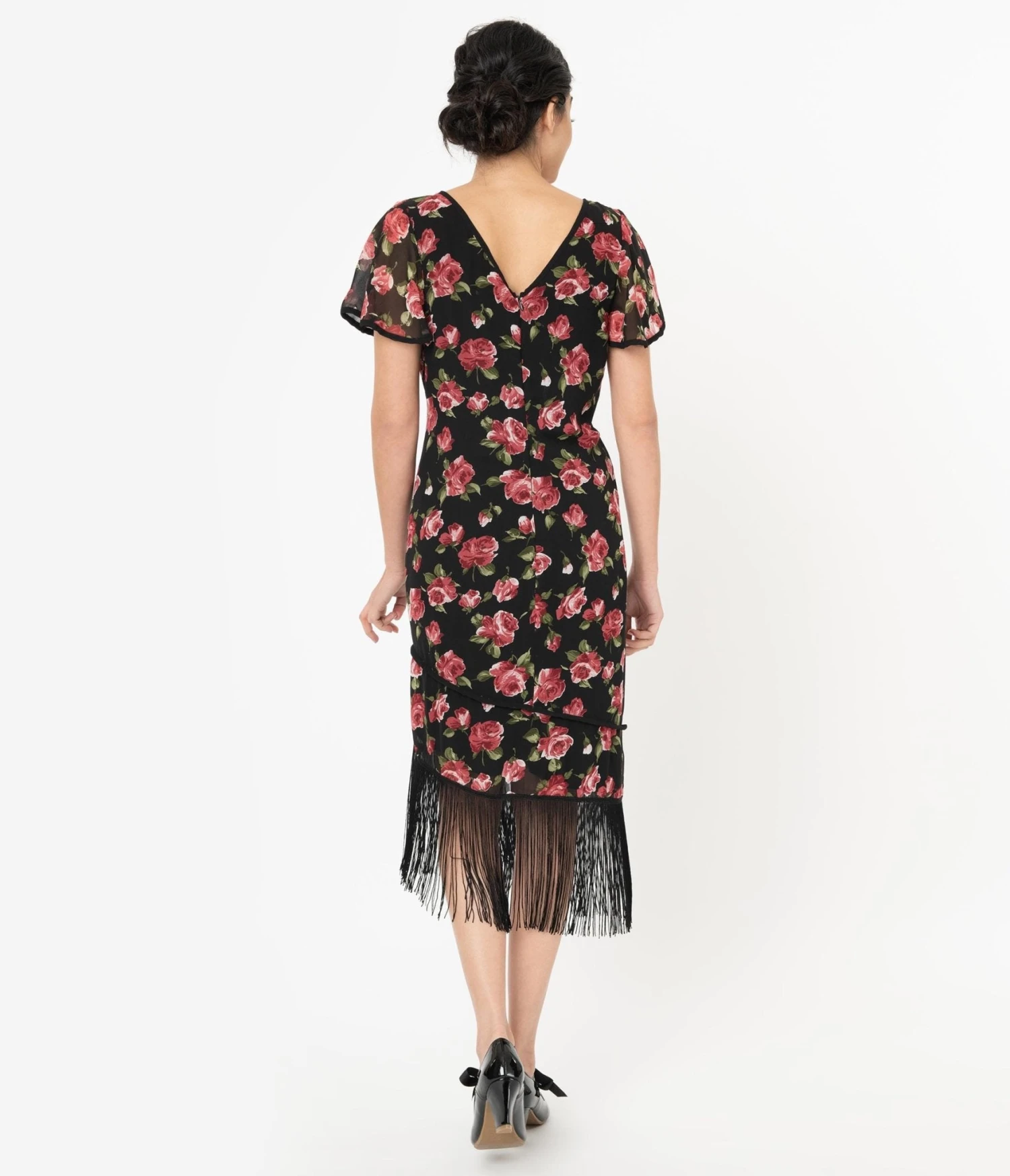 Make some time to dance on a table, dolls! This beautiful 1920s style frock from Unique Vintage is a sweet silhouette for some daytime dancing with pink florals cascading through a black backdrop. Crafted in a lightweight woven fabric, the romantic V-neckline is framed by sweet flutter sleeves as the casual, tapered form drops over your figure to an asymmetric hemline that sways with long black fringe. Outfitted with a back zipper, merriment is in your future!