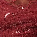 This stunning flapper dress features a dazzling array of burgundy beads and sequins throughout burgundy red mesh and lining. Complete with short sleeves, fringe, and a back zipper.