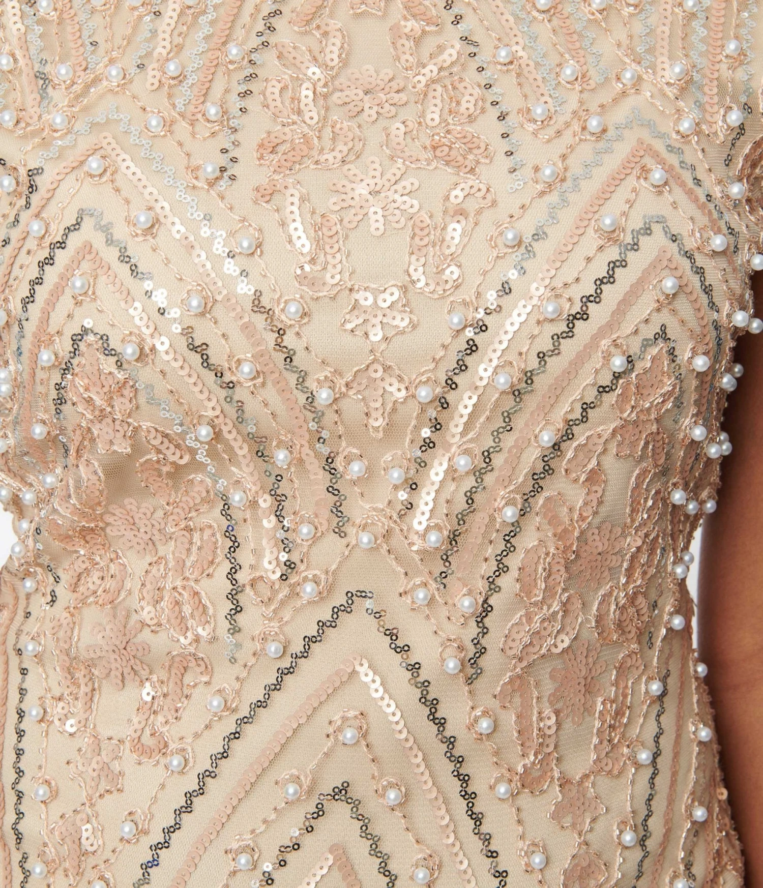 This romantic flapper inspired cocktail dress dances with champagne beading and silver sequins. Complete with beige lining and a back zipper.