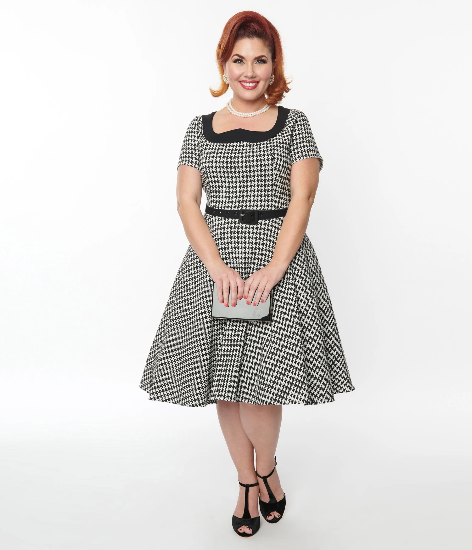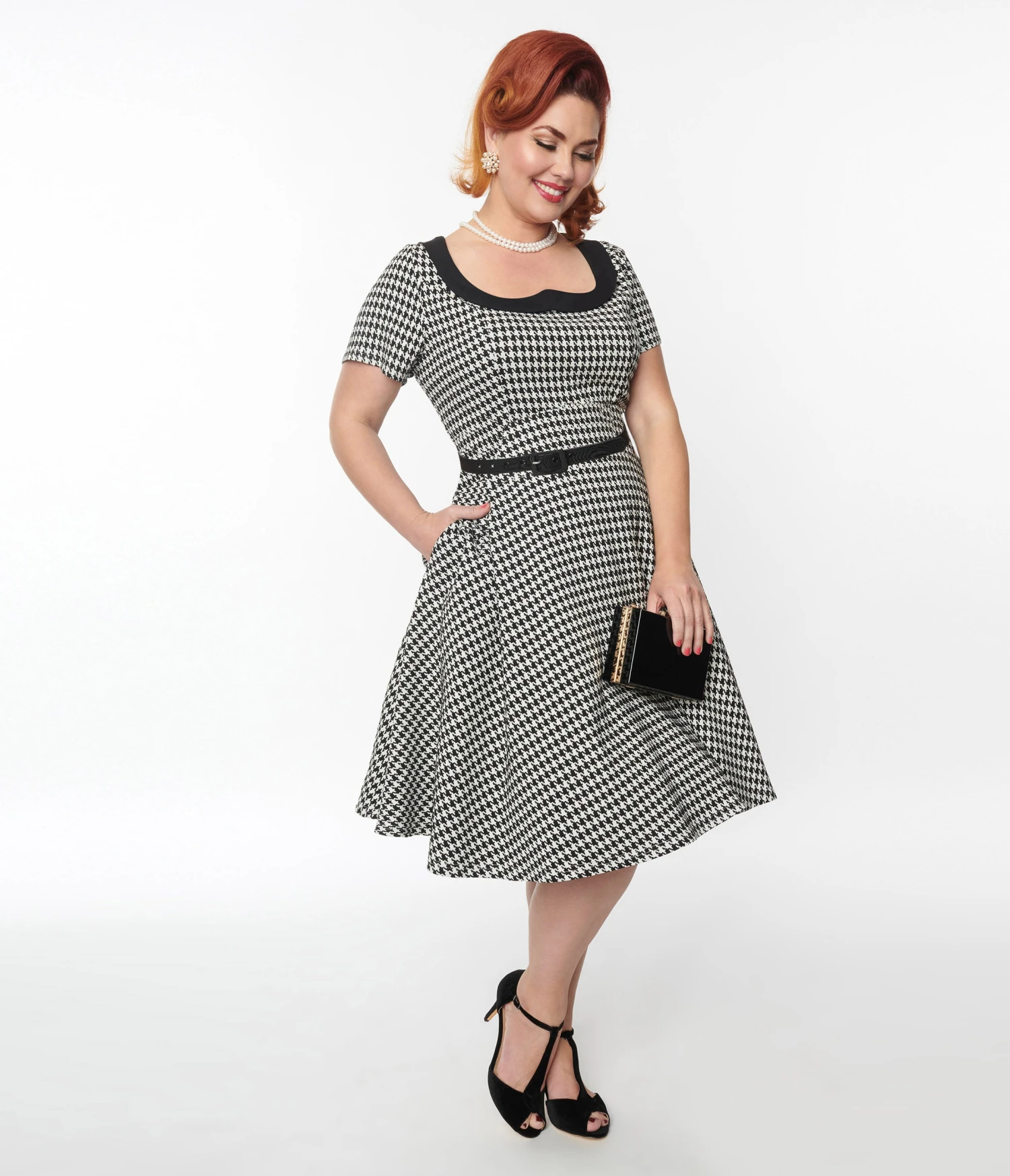 This charming 1950s inspired dress is crafted in a black and white houndstooth woven fabric and outfitted with a wide, black Peter Pan collar, a back zipper and side pockets.