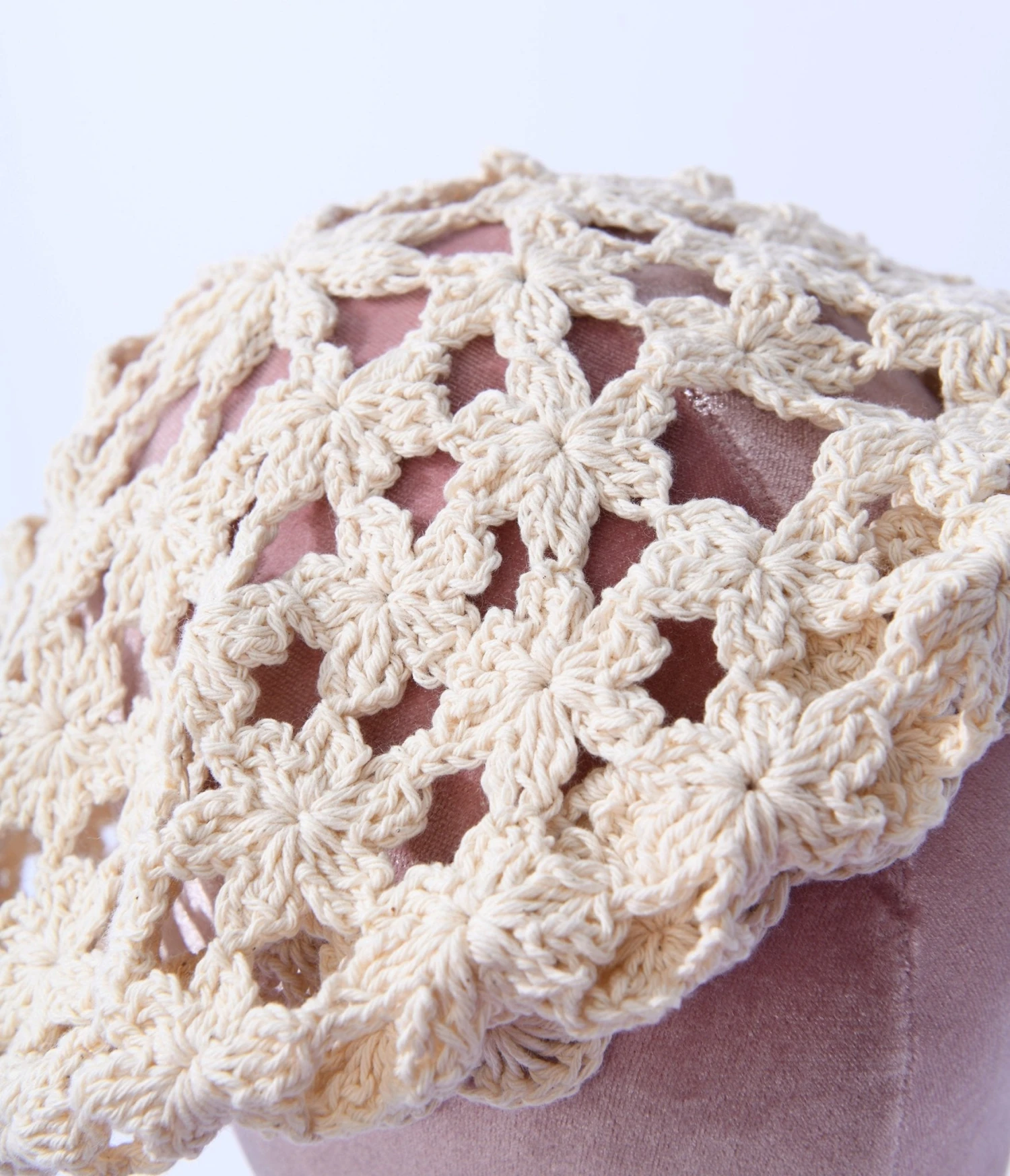 This sweet beret from Unique Vintage is crafted in a beige floral crochet pattern.