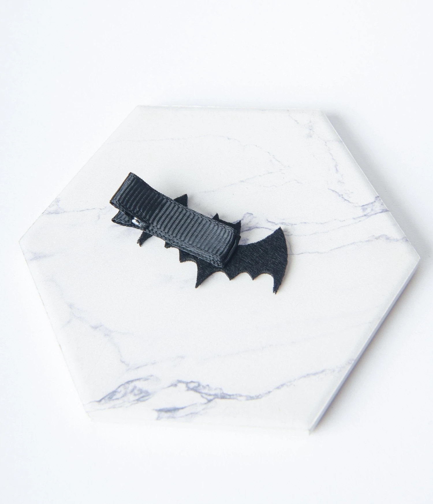 This spooky cute hair clip features a black bat and complete with a french barrette clasp.