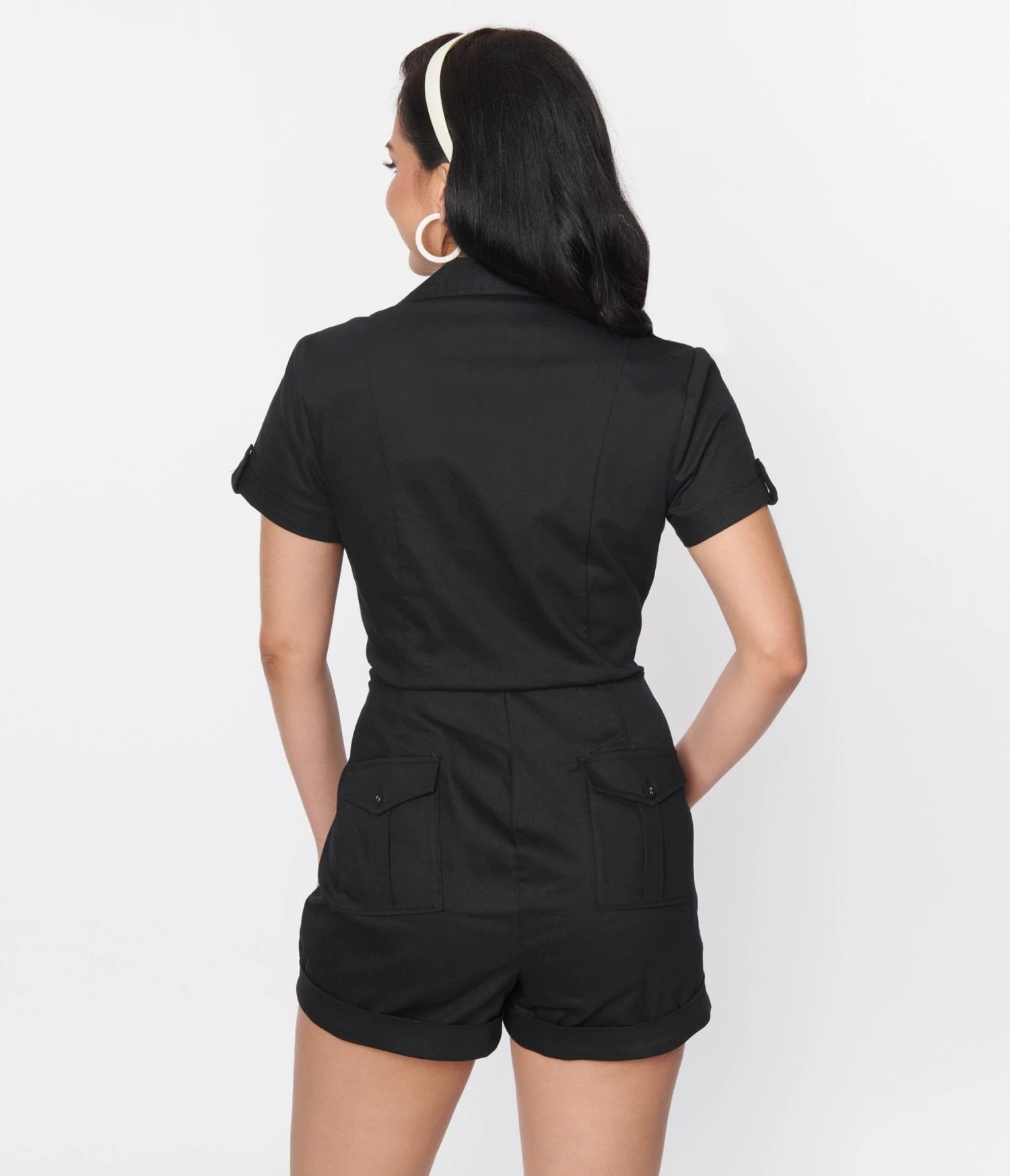 This rockabilly romper is crafted in a black stretch cotton blend, outfitted with a front zipper, back, side, and front chest pockets.