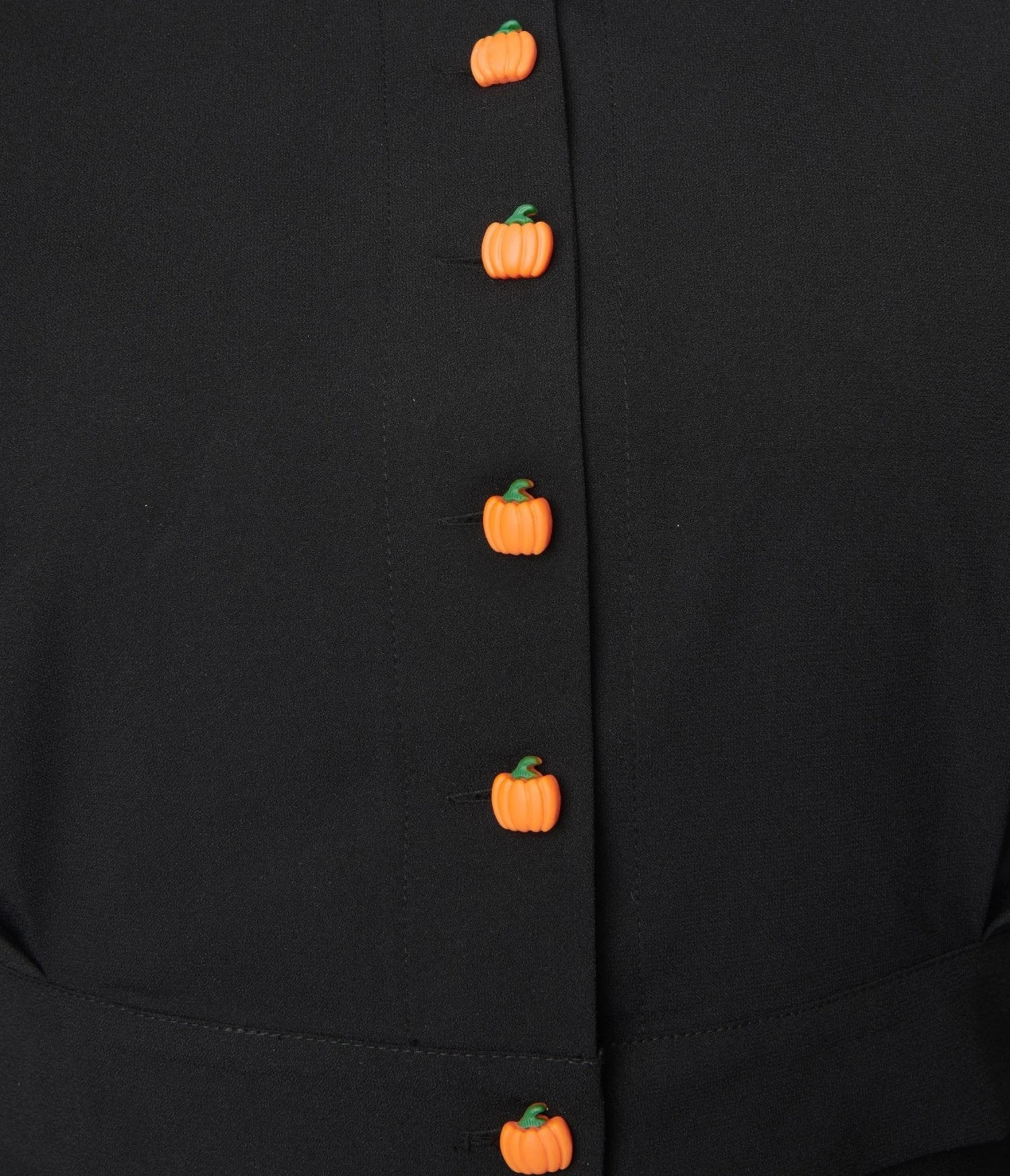 This charming 1950s style cardigan is crafted in a black woven and outfitted with an adorable orange pumpkin button up front. Complete with a crop length hemline.