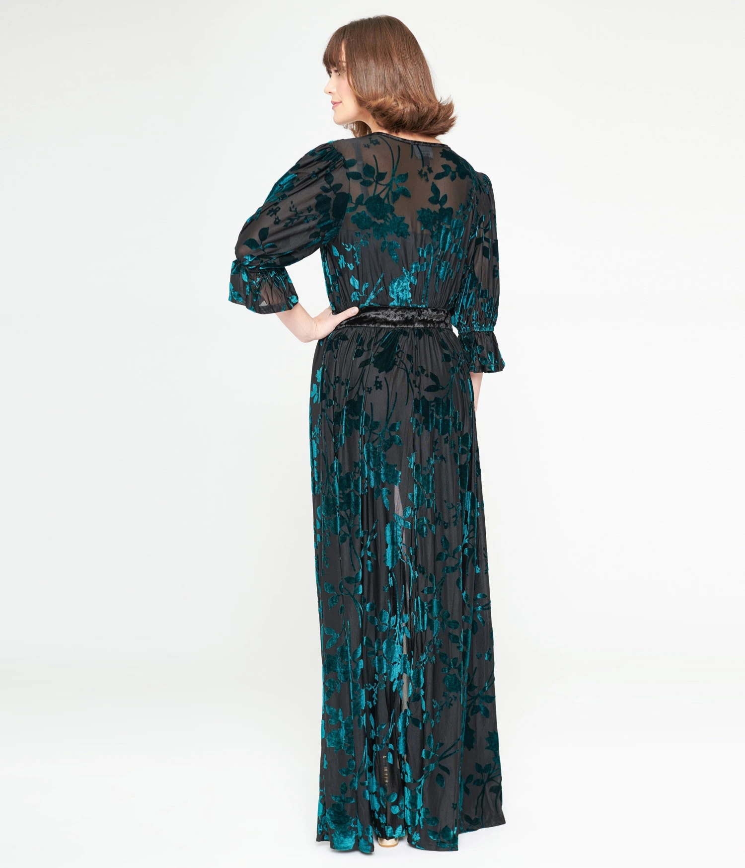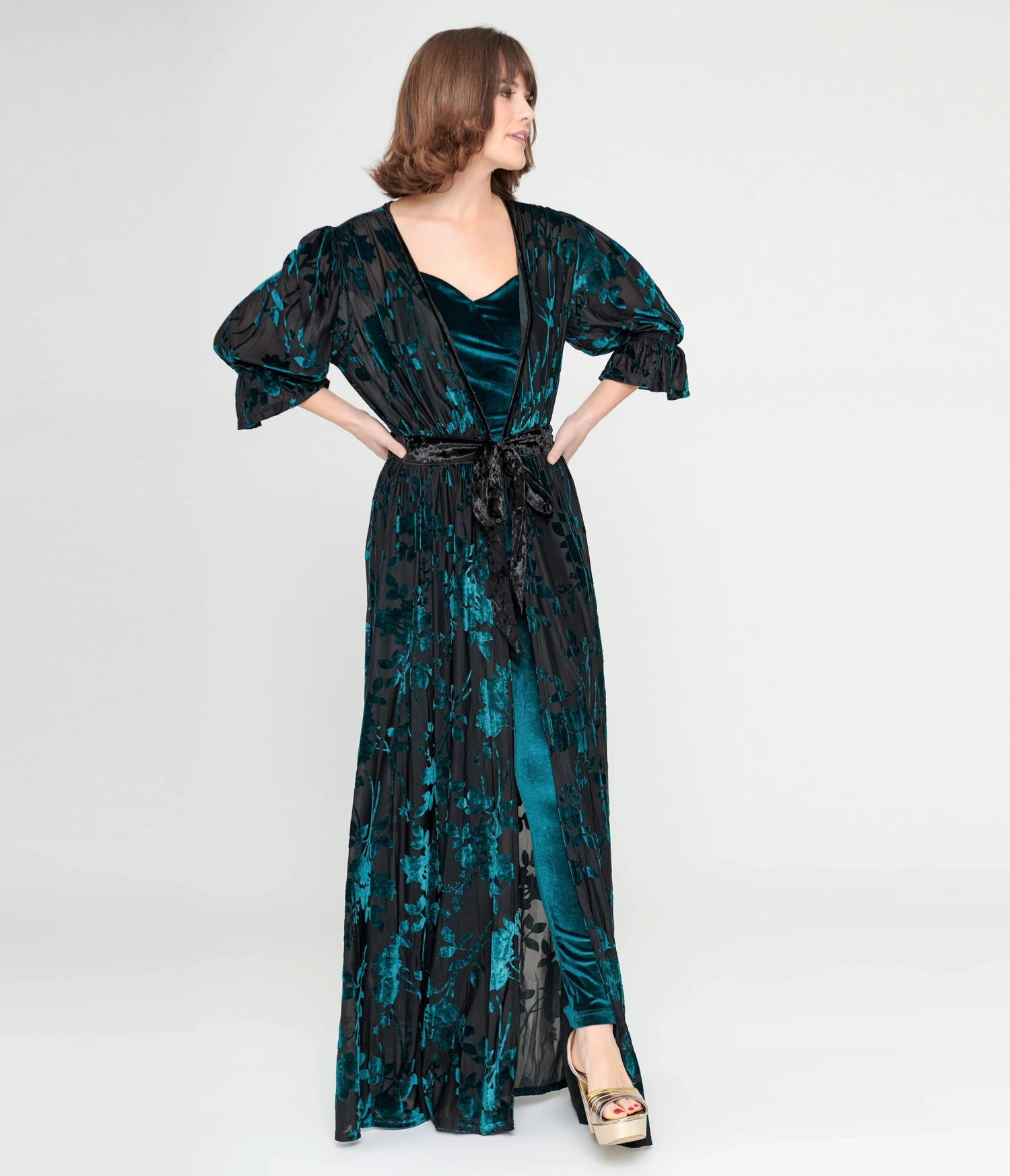 Be the first to review “Unique Vintage Black & Teal Floral Velvet Burnout Duster” Cancel reply