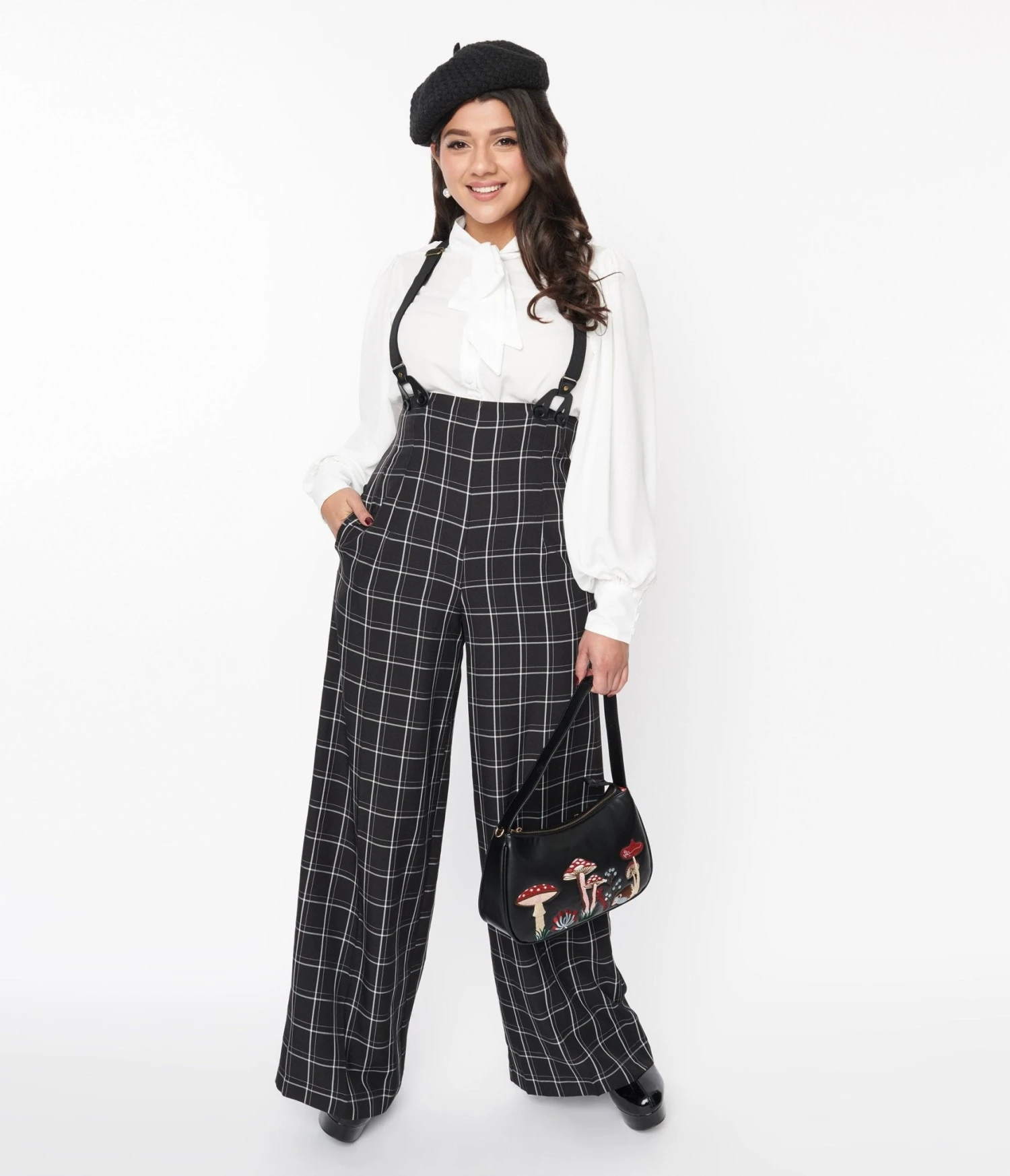 Crafted in a black windowpane plaid woven fabric, with a fabulous high waist is cinched with a back zipper while adjustable and removable suspender straps lend secure wear. The straight leg cut is outfitted with side pockets.
