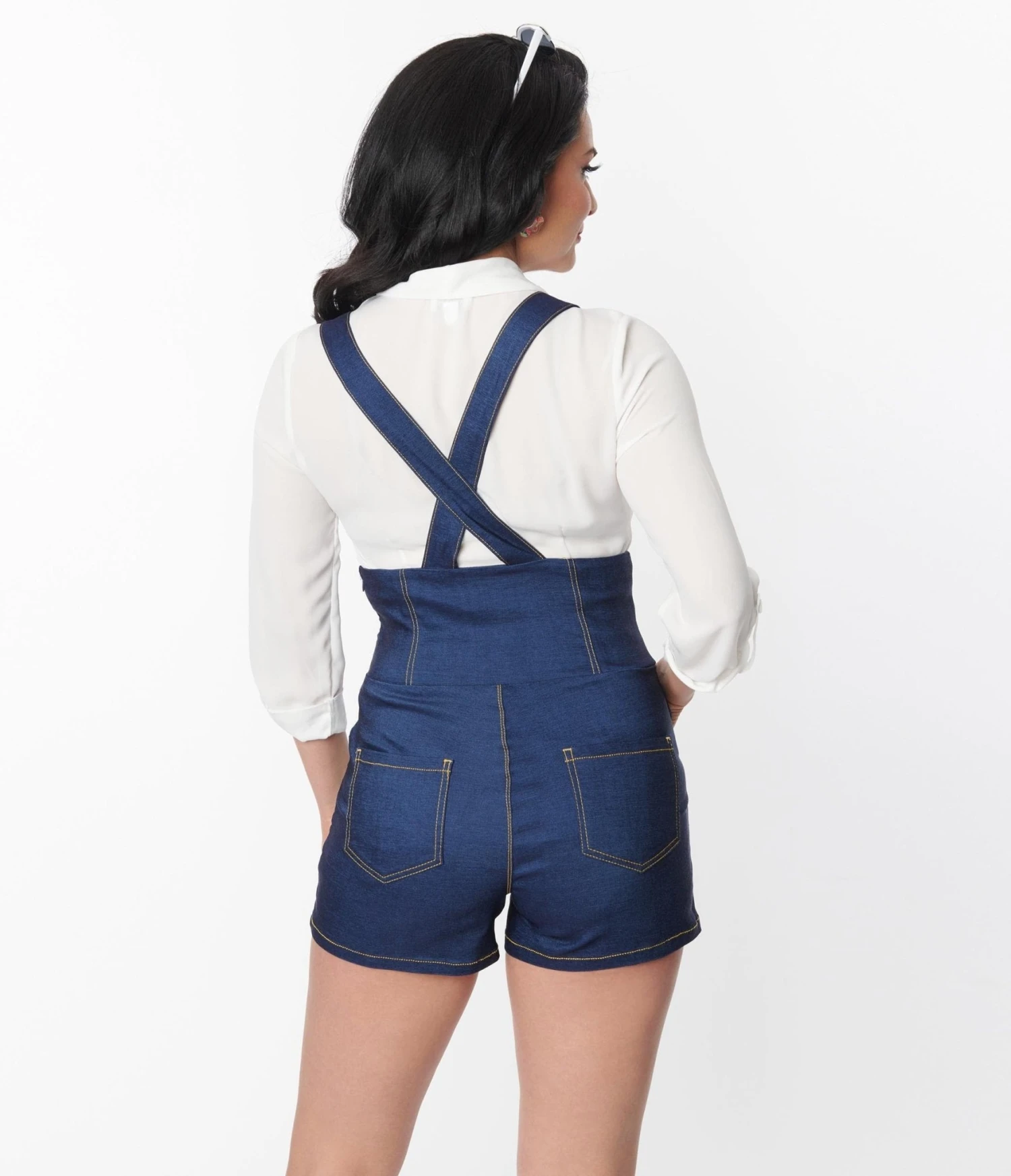 This fun and flirty pair of pinafore shorts is crafted in a fabulous blue denim bengaline. The banded waistline nips in your figure giving you an adorable retro silhouette, while the suspenders are adjustable for ease! Complete with a side zipper and front and back pockets.