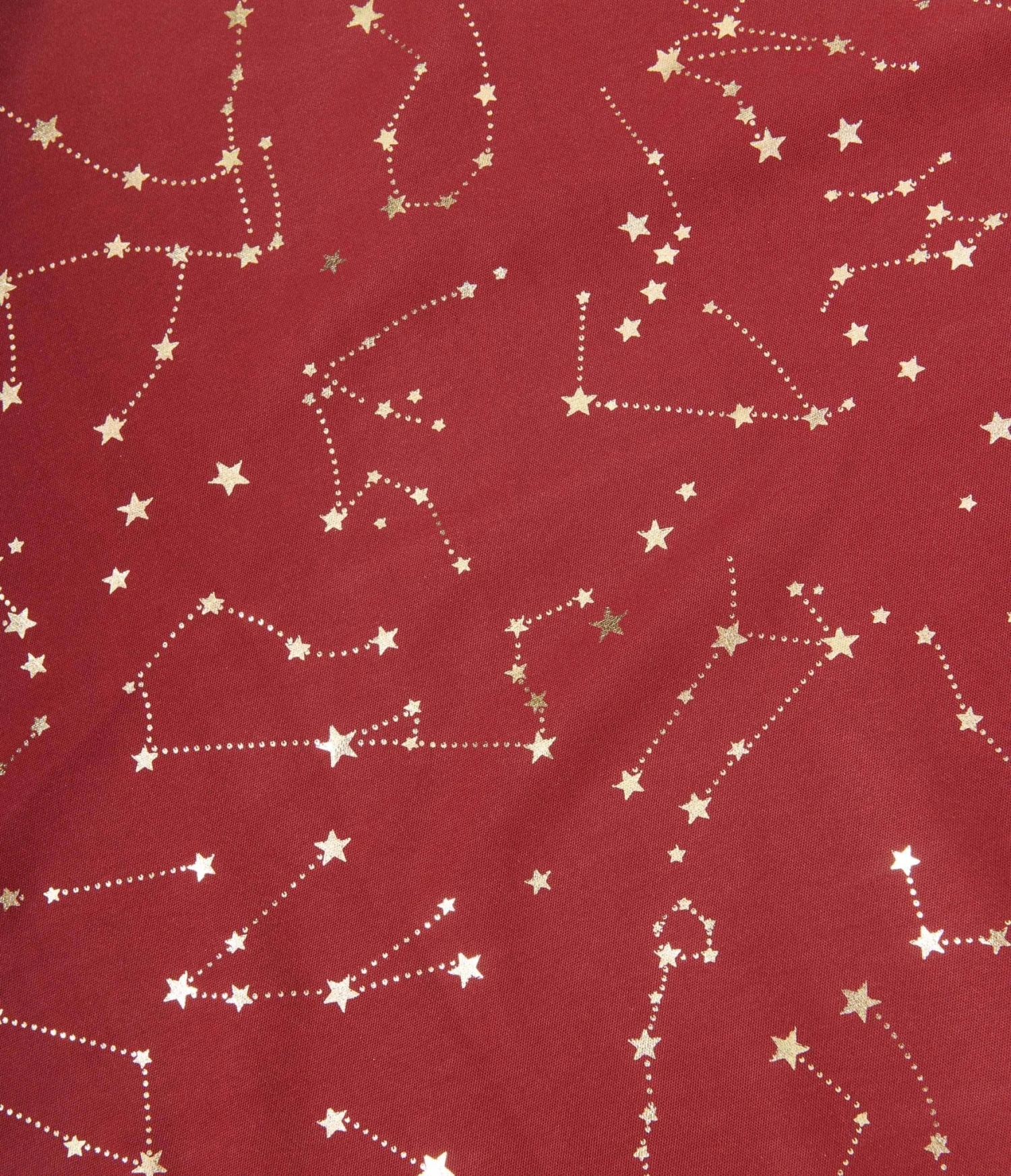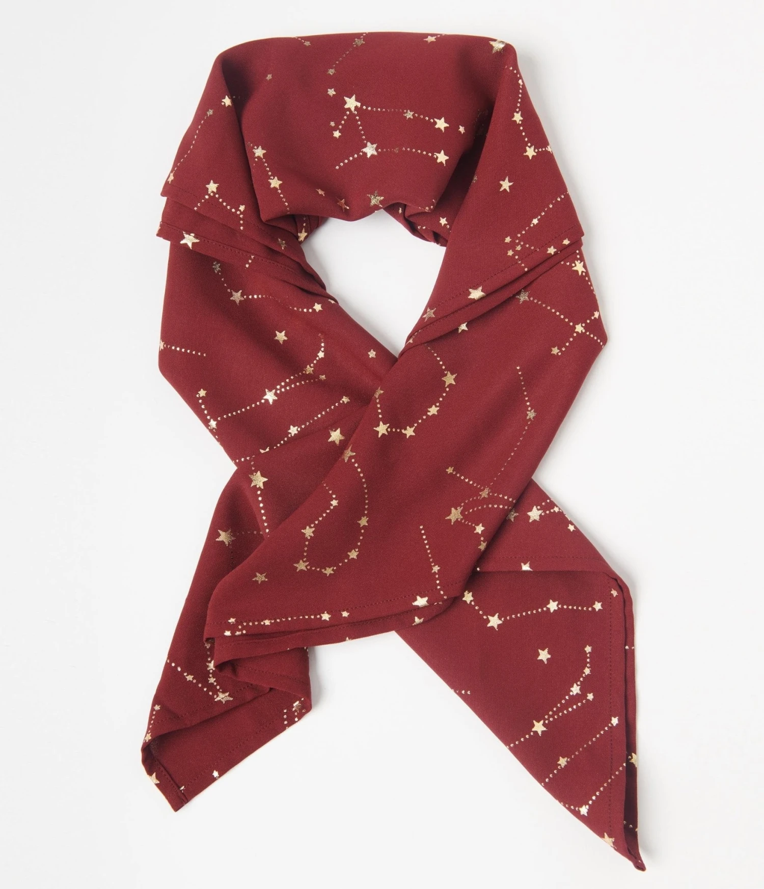 This sweet 1950’s style hair scarf is crafted in a sheer woven burgundy fabric that features shiny gold constellations throughout.