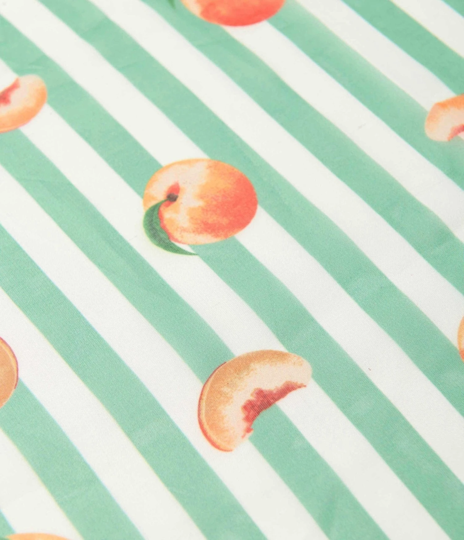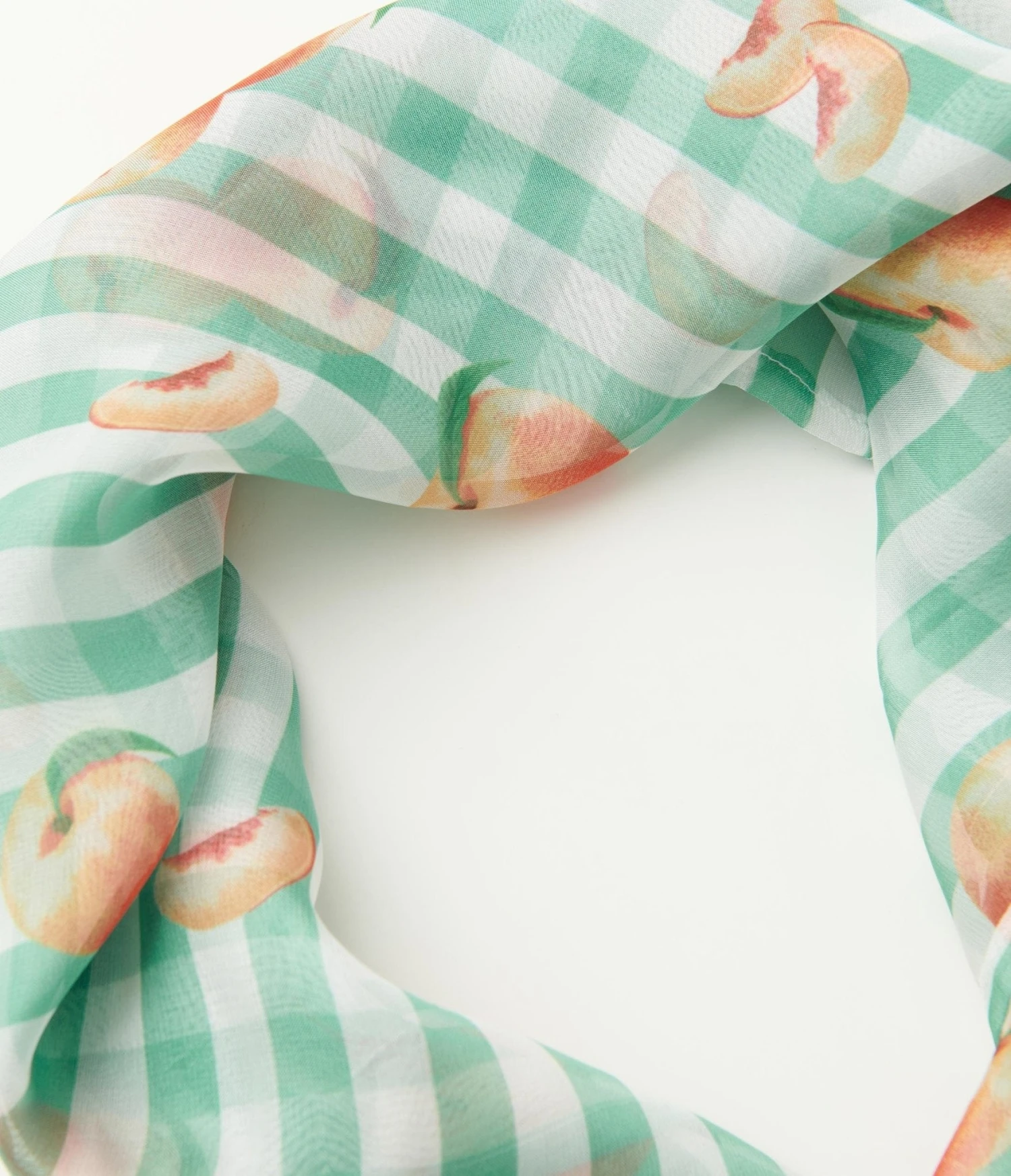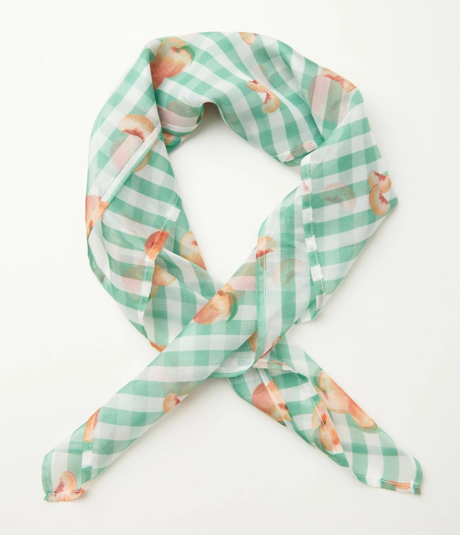 Set off your perfect pin-up presentation with this fabulous hair scarf from Unique Vintage, boasting light green and white stripes and dotted with peaches. A silky vintage inspired chiffon scarf perfect for tying up and around your divine ‘do – any excuse for a little sky-high hair help!