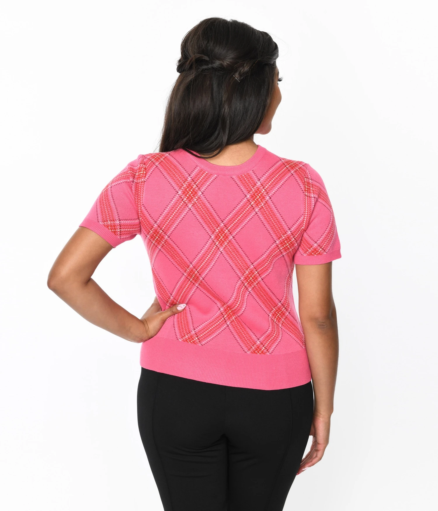This superbly soft 1950s style sweater is a darling separate cast in a soft knit that dances in a hot pink, red, and white bias plaid. Stay in place ribbing highlights the classic crew neckline, comfortable short sleeves, and straight hem.